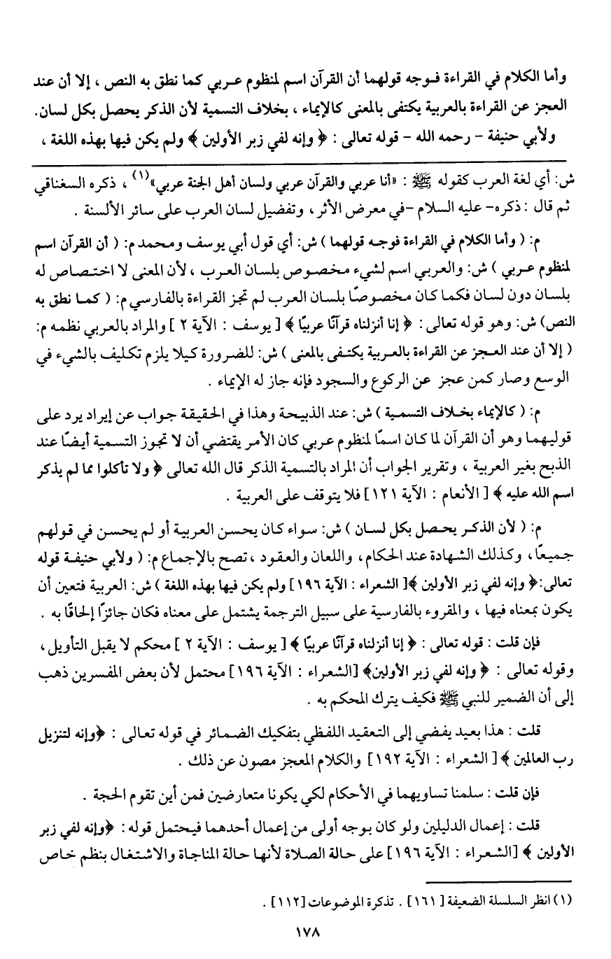 قلت: إعمال الدليلين ولو كان بوجه أولى من إعمال أحدهما، فيحتمل قوله: {وَإِنَّهُ لَفِي زُبُرِ الْأَوَّلِينَ} [الشعراء: 196] (الشعراء: الآية 196) على حالة الصلاة لأنها حالة المناجاة والاشتغال بنظم خاص