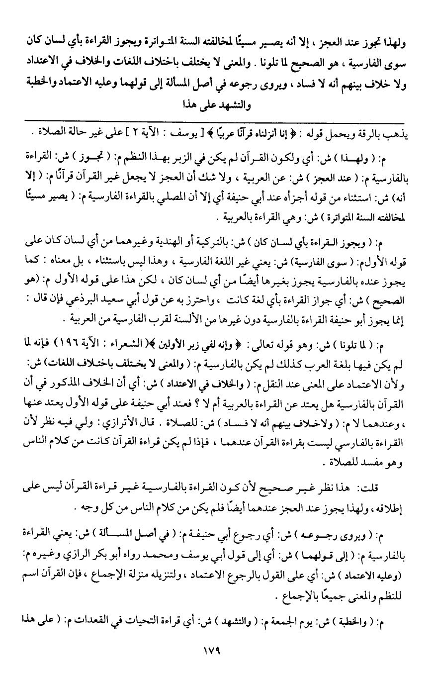 ويجوز القراءة بأي لسان كان سوى الفارسية، هو الصحيح لما تلونا. والمعنى لا يختلف باختلاف اللغات، والخلاف في الاعتداد، ولا خلاف بينهم أنه لا فساد، ويروى رجوعه في أصل المسألة إلى قولهما وعليه الاعتماد، والخطبة والتشهد على هذا