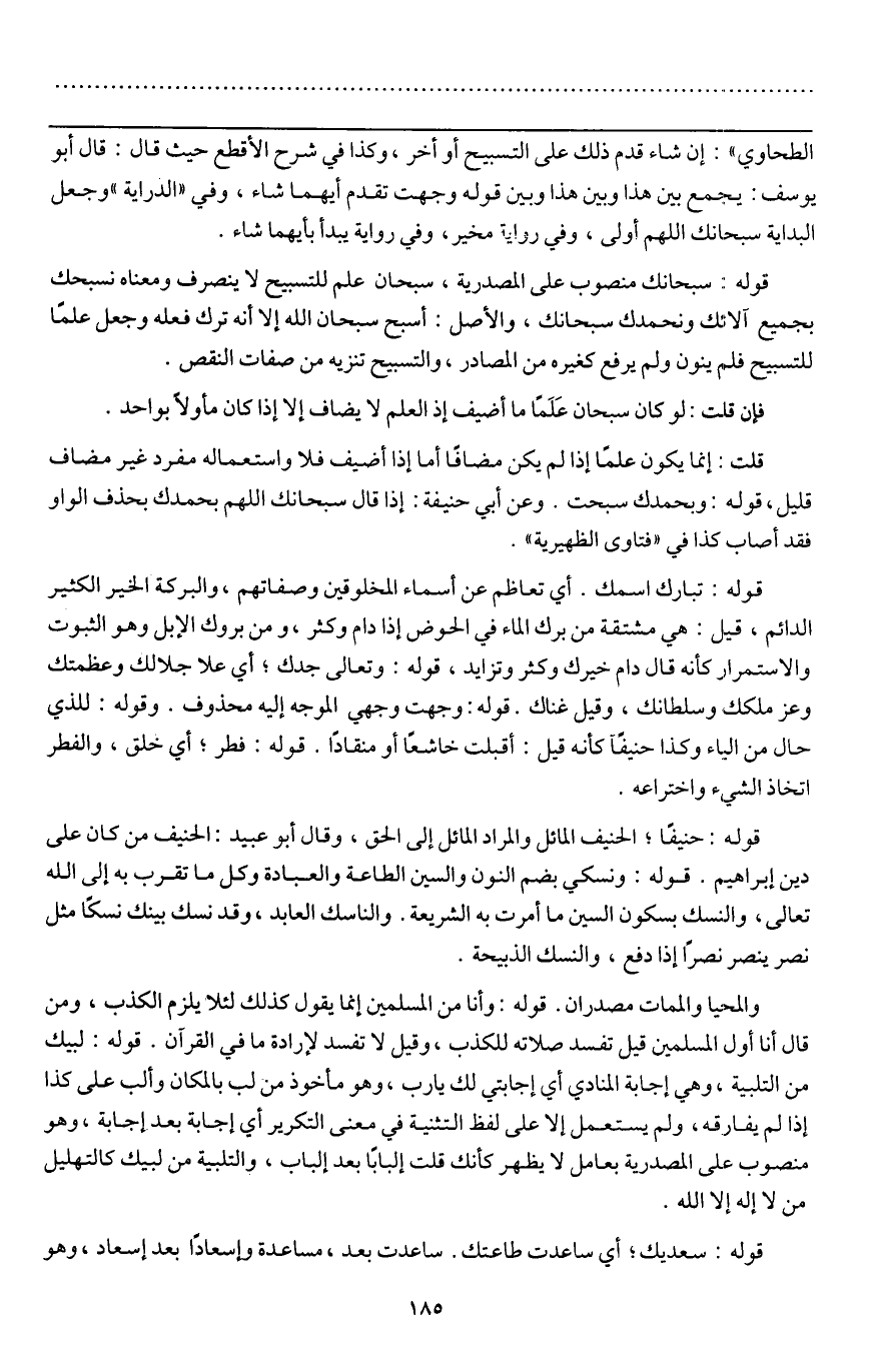 قوله: تبارك اسمك. أي تعاظم عن أسماء المخلوقين وصفاتهم، والبركة: الخير الكثير الدائم، قيل: هي مشتقة من برك الماء في الحوض: إذا دام وكثر، ومن بروك الإبل وهو الثبوت والاستمرار، كأنه قال: دام خيرك وكثر وتزايد، قوله: وتعالى جدك؛ أي علا جلالك وعظمتك وعز ملكك وسلطانك، وقيل: غناك. قوله: وجهت وجهي، الموجه إليه محذوف. وقوله: للذي، حال من الياء، وكذا حنيفا، كأنه قيل: أقبلت خاشعا أو منقادا. قوله: فطر؛ أي خلق، والفطر: اتخاذ الشيء واختراعه.
