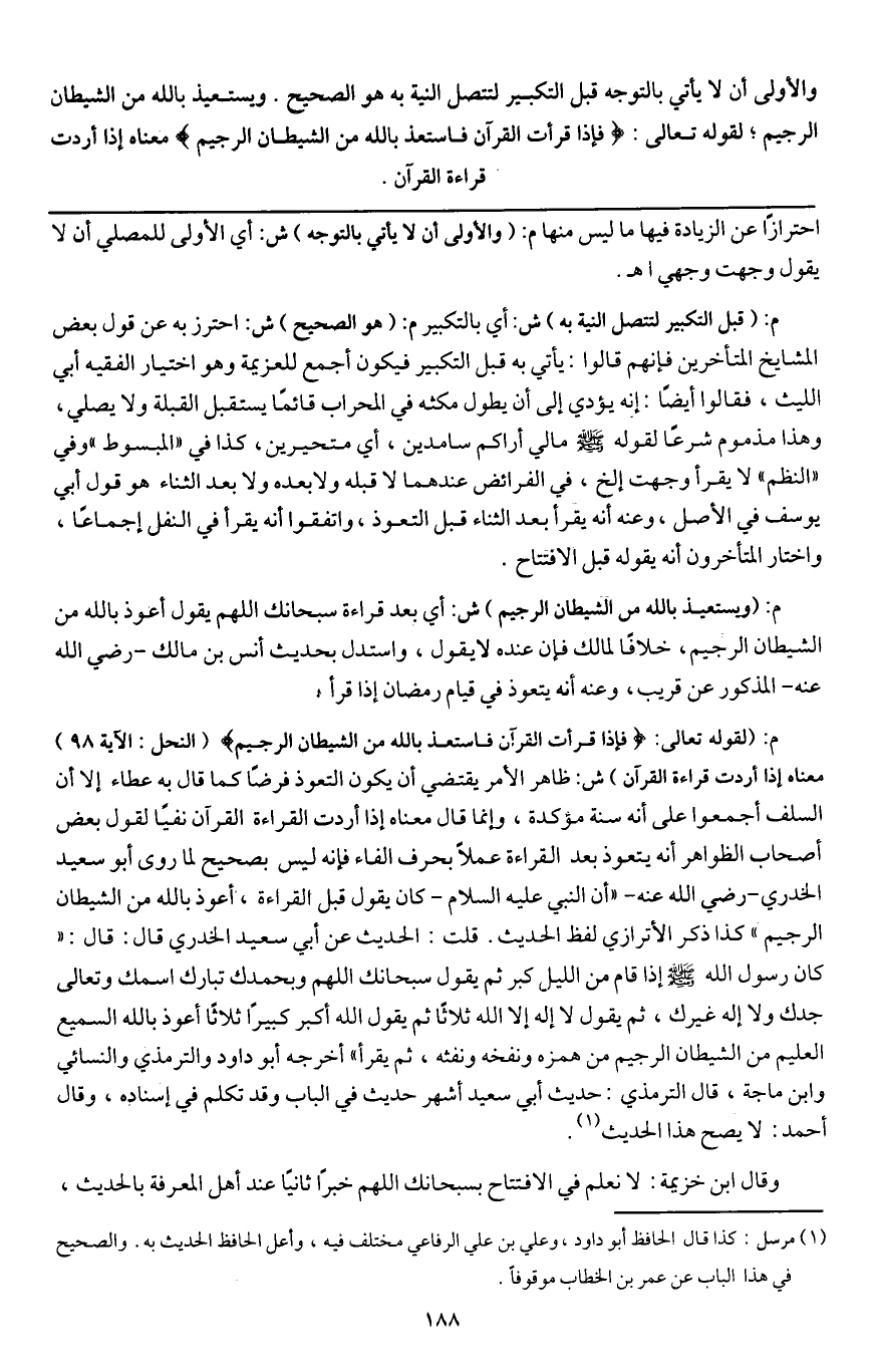 م: (لقول تعالى: {فَإِذَا قَرَأْتَ الْقُرْآنَ فَاسْتَعِذْ بِاللَّهِ مِنَ الشَّيْطَانِ الرَّجِيمِ} [النحل: 98] (النحل الآية 98) معناه: إذا أردت قراءة الْقُرْآن) ش: ظاهر الأمر يقتضي أن يكون التعوذ فرضا كما قال به عطاء، إلا أن السلف أجمعوا على أنه سنة مؤكدة، وإنما قال: معناه: إذا أردت القراءة؛ نفيا لقول بعض أصحاب الظواهر أنه يتعوذ بعد القراءة عملا بحرف الفاء؛ فإنه ليس بصحيح لما روى أبو سيعد الخدري - رَضِيَ اللَّهُ عَنْهُ - «أن النبي - عَلَيْهِ السَّلَامُ - كان يقول قبل القراءة: أعوذ بالله من الشيطان الرجيم» ، كذا ذكر الأترازي لفظ الحديث. قلت: الحديث عن أبي سعيد الخدري قال: «كان رسول الله - صَلَّى اللَّهُ عَلَيْهِ وَسَلَّمَ - إذا قام من الليل كبر ثم يقول: سبحانك اللهم وبحمدك تبارك اسمك وتعالى جدك ولا إله غيرك، ثم يقول: لا إله إلا الله، ثلاثا، ثم يقول: الله أكبر كبيرا، ثلاثا، أعوذ بالله السميع العليم من الشيطان الرجيم من همزه ونفخه ونفثه، ثم يقرأ» أخرجه أبو داود والترمذي والنسائي وابن ماجه، قال الترمذي: حديث أبي سعيد أشهر حديث في الباب وقد تكلم في إسناده، وقال أحمد: لا يصح هذا الحديث.