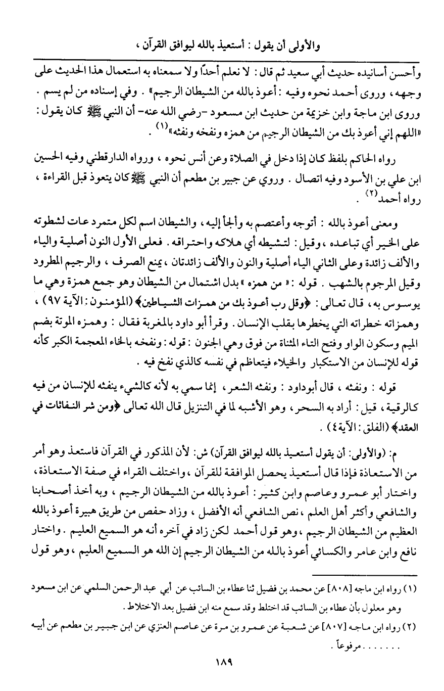 ومعنى أعوذ بالله: أتوجه وأعتصم به وألجأ إليه، والشيطان اسم لكل متمرد عات لشطوته على الخير؛ أي تباعده، وقيل: لتشيطه؛ أي هلاكه واحتراقه. فعلى الأول النون أصلية والياء والألف زائدة، وعلى الثاني الياء أصلية والنون والألف زائدتان، يمنع الصرف، والرجيم المطرود، وقيل المرجوم بالشهب. قوله: " من همزه " بدل اشتمال من الشيطان وهو جمع همزة وهي ما يوسوس به، قال تعالى: {فَإِذَا قَرَأْتَ الْقُرْآنَ فَاسْتَعِذْ بِاللَّهِ مِنَ الشَّيْطَانِ الرَّجِيمِ} [النحل: 98] (المؤمنون: الآية 97) ، وهمزاته خطراته التي يخطرها بقلب الإنسان. وقرأ أبو داود بالمغربة فقال: وهمزه: الموتة بضم الميم وسكون الواو وفتح التاء المثناة من فوق، وهي الجنون. قوله: ونفخه، بالخاء المعجمة: الكبر، كأن قوله للإنسان من الاستكبار والخيلاء فيتعاظم في نفسه كالذي نفخ فيه.