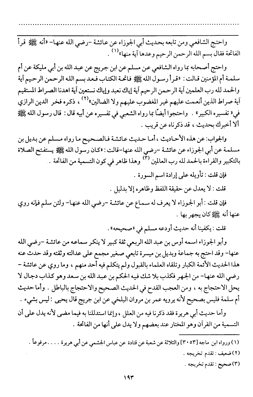 والجواب عن هذه الأحاديث، أما حديث عائشة فالصحيح ما رواه مسلم عن بديل بن مسلمة عن أبي الجوزاء عن عائشة - رَضِيَ اللَّهُ عَنْهَا - قالت: «كان رسول الله - صَلَّى اللَّهُ عَلَيْهِ وَسَلَّمَ - يستفتح الصلاة بالتكبير، والقراءة بالحمد لله رب العالمين» وهذا ظاهر في كون التسمية من الفاتحة.
