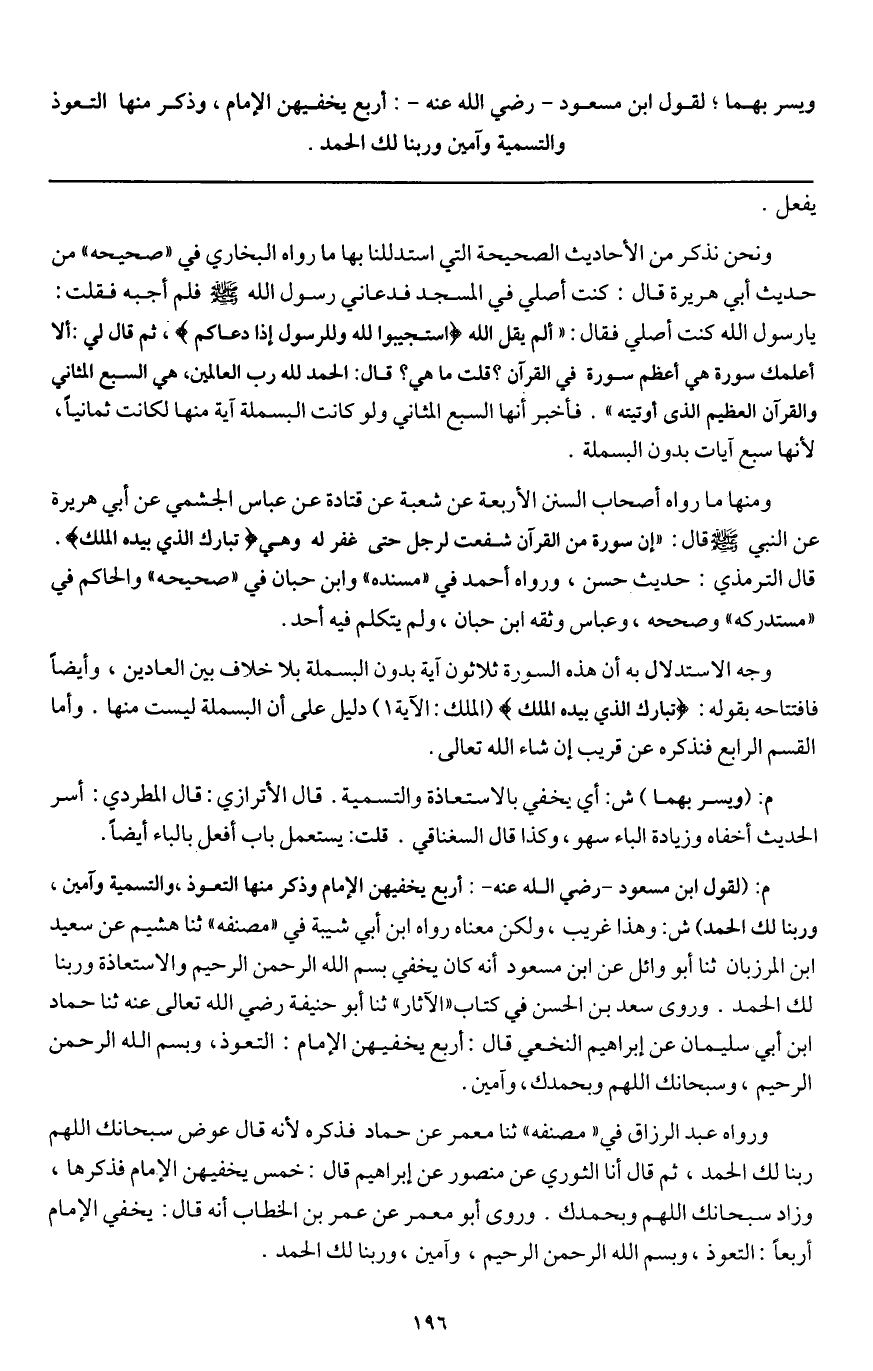 وجه الاستدلال به أن هذه السورة ثلاثون آية بدون البسملة بلا خلاف بين العادين، وأيضا فافتتاحه بقوله: {تَبَارَكَ الَّذِي بِيَدِهِ الْمُلْكُ} [الملك: 1] (الملك: الآية 1) دليل على أن البسملة ليست منها. وأما القسم الرابع فنذكره عن قريب إن شاء الله تعالى.