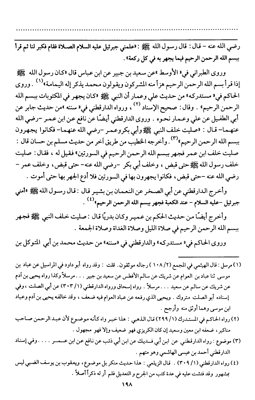 ـــــــــــــــــــــــــــــQ- رَضِيَ اللَّهُ عَنْهُ - قال: قال رسول الله - صَلَّى اللَّهُ عَلَيْهِ وَسَلَّمَ -: «علمني جبرائيل - عَلَيْهِ السَّلَامُ - الصلاة فقام فكبر لنا ثم قرأ ببسم الله الرحمن الرحيم فيما يجهر به في كل ركعة» .