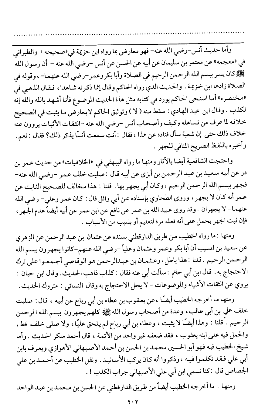 ومنها ما أخرجه الخطيب أيضا، عن يعقوب عن عطاء بن أبي رباح عن أبيه، قال: «صليت خلف علي بن أبي طالب، وعدة من أصحاب رسول الله - صَلَّى اللَّهُ عَلَيْهِ وَسَلَّمَ - كلهم يجهرون ببسم الله الرحمن الرحيم» . قلنا: وهذا أيضا لا يثبت، وعطاء بن أبي رباح لم يلحق عليا، ولا صلى خلفه قط، والحمل فيه على ابنه يعقوب، فقد ضعفه غير واحد من الأئمة، قال أحمد: منكر الحديث. وأما شيخ الخطيب فيه فهو أبو الحسين محمد بن الحسن بن أحمد الأصبهاني الأهوازي، ويعرف بابن أبي علي، فقد تكلموا فيه، وذكروا أنه كان يركب الأسانيد. ونقل الخطيب عن أحمد بن علي الجصاص قال: كنا نسمي ابن أبي علي الأصبهاني جراب الكذب!.