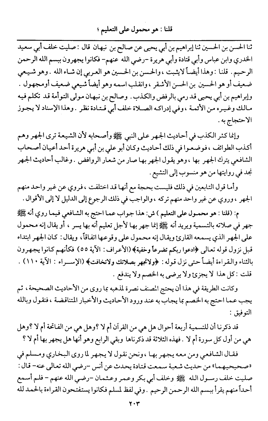 ـــــــــــــــــــــــــــــQثنا الحسن بن الحسين ثنا إبراهيم بن أبي يحيى عن صالح بن نبهان قال: صليت خلف أبي سعيد الخدري وابن عباس وأبي قتادة وأبي هريرة - رَضِيَ اللَّهُ عَنْهُمْ -، فكانوا يجهرون ببسم الله الرحمن الرحيم. قلنا: وهذا أيضا لا يثبت، والحسن بن الحسين هو العربي إن شاء الله. وهو شيعي ضعيف، أو هو الحسين بن الحسن الأشقر، وانقلب اسمه، وهو أيضا شيعي ضعيف أو مجهول. وإبراهيم بن أبي يحيى قد رمي بالرفض والكذب. وصالح بن نبهان مولى التوأمة قد تكلم فيه مالك وغيره من الأئمة، وفي إدراكه الصلاة خلف أبي قتادة نظر. وهذا الإسناد لا يجوز الاحتجاج به.
