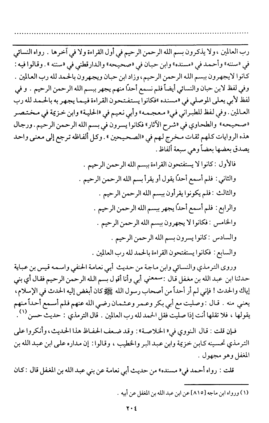 وفي لفظ لابن حبان والنسائي أيضا: «فلم نسمع أحدا منهم يجهر ببسم الله الرحمن الرحيم» . وفي لفظ لأبي يعلى الموصلي في "مسنده ": «فكانوا يستفتحون القراءة فيما يجهر به بالحمد لله رب العالمين» . وفي لفظ للطبراني في "معجمه " وأبي نعيم في "الحلية " وابن خزيمة في مختصر "صحيحه " والطحاوي في "شرح الآثار ": «فكانوا يسرون في بِسْمِ اللَّهِ الرَّحْمَنِ الرَّحِيمِ» . ورجال هذه الروايات كلهم ثقات مخرج لهم في " الصحيحين ". وكل ألفاظه ترجع إلى معنى واحد يصدق بعضها بعضا وهي سبعة ألفاظ: