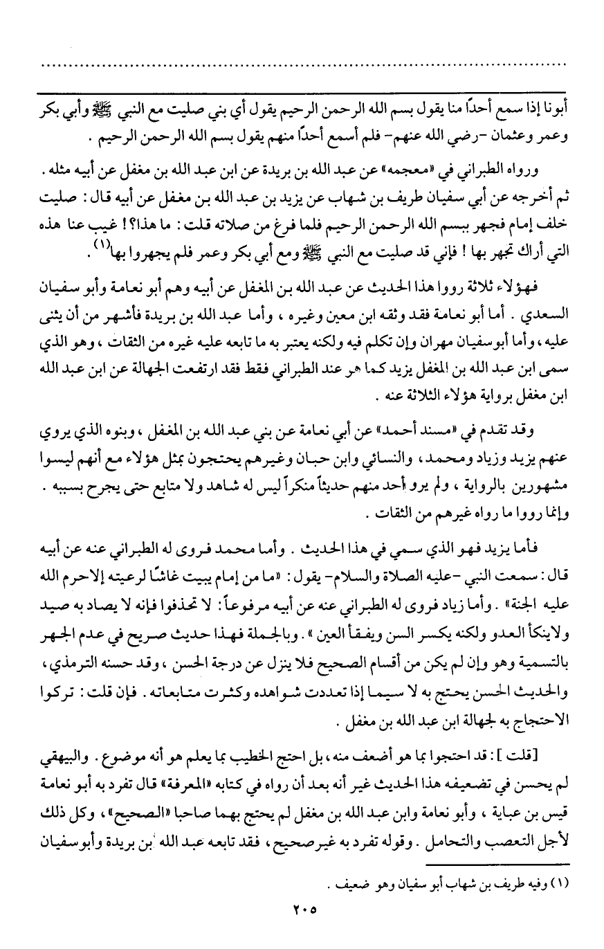 ورواه الطبراني في "معجمه " عن عبد الله بن بريدة عن ابن عبد الله بن مغفل عن أبيه مثله. ثم أخرجه عن أبي سفيان طريف بن شهاب عن يزيد بن عبد الله بن مغفل عن أبيه قال: «صليت خلف إمام فجهر ببسم الله الرحمن الرحيم، فلما فرغ من صلاته قلت: ما هذا؟! غيب عنا هذه التي أراك تجهر بها! فإني قد صليت مع النبي - صَلَّى اللَّهُ عَلَيْهِ وَسَلَّمَ - ومع أبي بكر وعمر فلم يجهروا بها» .