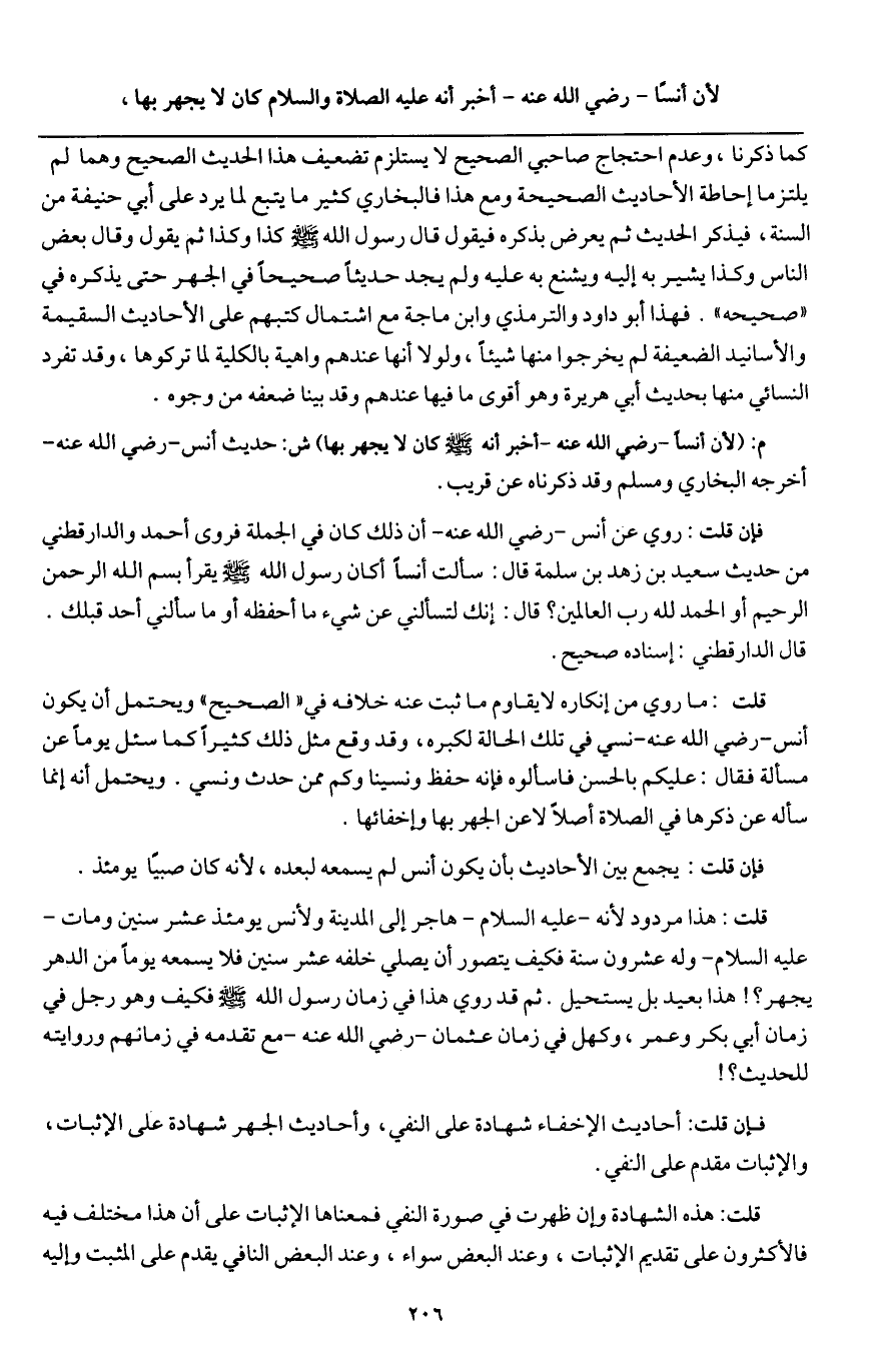 قلت: هذا مردود لأنه - عَلَيْهِ السَّلَامُ - هاجر إلى المدينة ولأنس يومئذ عشر سنين، ومات - عَلَيْهِ السَّلَامُ - وله عشرون سنة فكيف يتصور أنه يصلي خلفه عشر سنين فلا يسمعه يوما من الدهر يجهر؟! هذا بعيد بل يستحيل. ثم قد روي هذا في زمان رسول الله - صَلَّى اللَّهُ عَلَيْهِ وَسَلَّمَ - فكيف وهو رجل في زمان أبي بكر وعمر، وكهل في زمان عثمان - رَضِيَ اللَّهُ عَنْهُ - مع تقدمه في زمانهم وروايته للحديث؟!