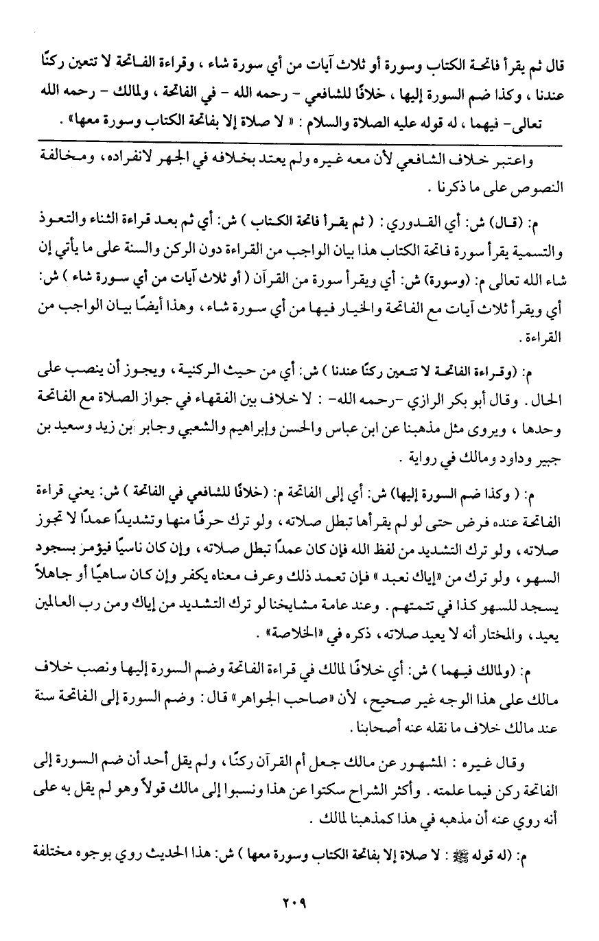 وقال غيره: المشهور عن مالك جعل أم القرآن ركنا، ولم يقل أحد أن ضم السورة إلى الفاتحة ركن فيما علمته. وأكثر الشراح سكتوا عن هذا ونسبوا إلى مالك قولا وهو لم يقل به، على أنه روي عنه أن مذهبه في هذا كمذهبنا لمالك.