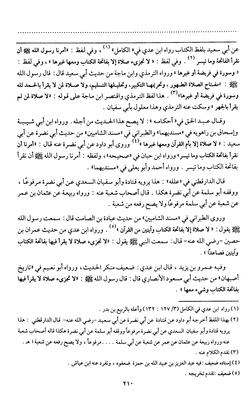 ـــــــــــــــــــــــــــــQعن أبي سعيد بلفظ الكتاب رواه ابن عدي في " الكامل "، وفي لفظ: «أمرنا رسول الله - صَلَّى اللَّهُ عَلَيْهِ وَسَلَّمَ - أن نقرأ الفاتحة وما تيسر» . وفي لفظ: «لا تجزئ صلاة إلا بفاتحة الكتاب ومعها غيرها» ، وفي لفظ: «وسورة، في فريضة أو غيرها» ورواه الترمذي وابن ماجه من حديث أبي سعيد قال: قال رسول الله - صَلَّى اللَّهُ عَلَيْهِ وَسَلَّمَ -: «مفتاح الصلاة الطهور، وتحريمها التكبير، وتحليلها التسليم، ولا صلاة لمن لا يقرأ بالحمد لله وسورة في فريضة وغيرها» . هذا لفظ الترمذي، واقتصر ابن ماجه على قوله: «لا صلاة لمن لم يقرأ بالجهر» وسكت عنه الترمذي، وهذا معلول بأبي سفيان.