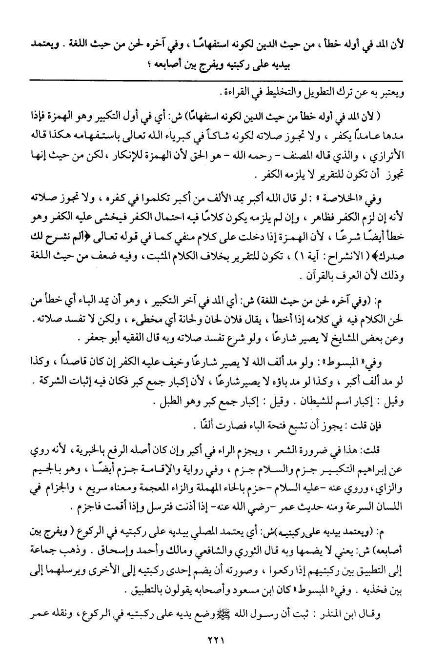 وفي " الخلاصة ": لو قال: الله أكبر، بمد الألف من أكبر، تكلموا في كفره، ولا تجوز صلاته لأنه إن لزمه الكفر فظاهر، وإن لم يلزمه يكون كلاما فيه احتمال الكفر فيخشى عليه الكفر، وهو خطأ أيضا شرعا، لأن الهمزة إذا دخلت على كلام منفي كما في قَوْله تَعَالَى: {أَلَمْ نَشْرَحْ لَكَ صَدْرَكَ} [الشرح: 1] (الانشراح: آية1) ، تكون للتقرير بخلاف الكلام المثبت، وفيه ضعف من حيث اللغة وذلك لأن العرف بالقرآن.