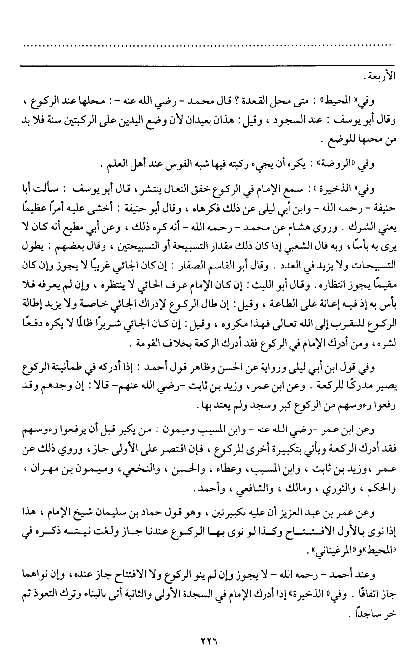 وفي قول ابن أبي ليلى ورواية عن الحسن وظاهر قول أحمد: إذا أدركه في طمأنينة الركوع يصير مدركا للركعة. وعن ابن عمر، وزيد بن ثابت - رَضِيَ اللَّهُ عَنْهُمْ - قالا: إن وجدهم وقد رفعوا رءوسهم من الركوع كبر وسجد ولم يعتد بها.