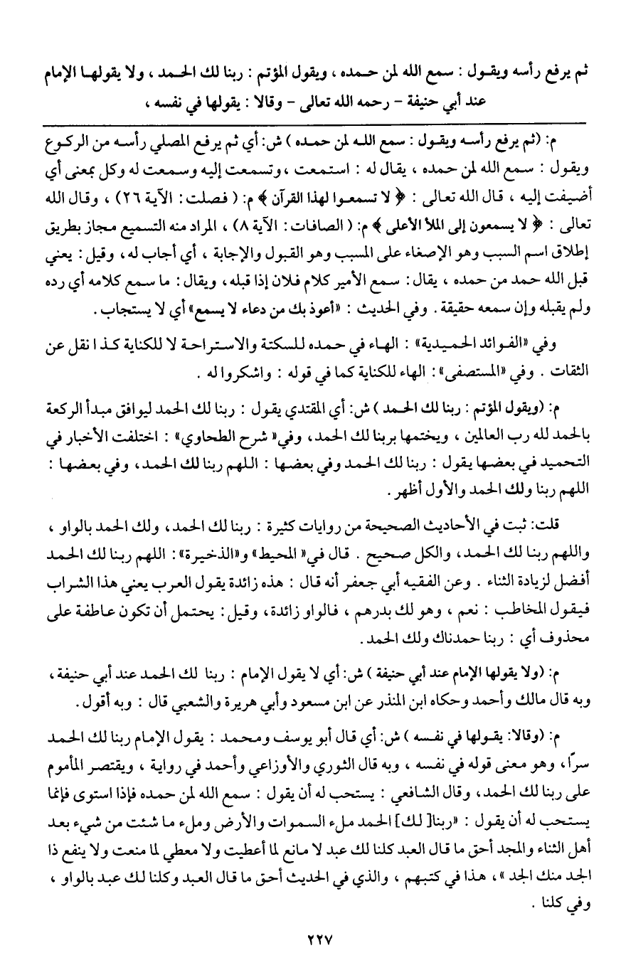 وقلت: ثبت في الأحاديث الصحيحة من روايات كثيرة: ربنا لك الحمد، ولك الحمد بالواو، واللهم ربنا لك الحمد، والكل صحيح. قال في " المحيط " و " الذخيرة ": اللهم ربنا لك الحمد أفضل لزيادة الثناء. وعن الفقيه أبي جعفر أنه قال: هذه زائدة، يقول العرب يعني هذا الشراب فيقول المخاطب: نعم، وهو لك بدرهم، فالواو زائدة، وقيل: يحتمل أن تكون عاطفة على محذوف أي: ربنا حمدناك ولك الحمد.