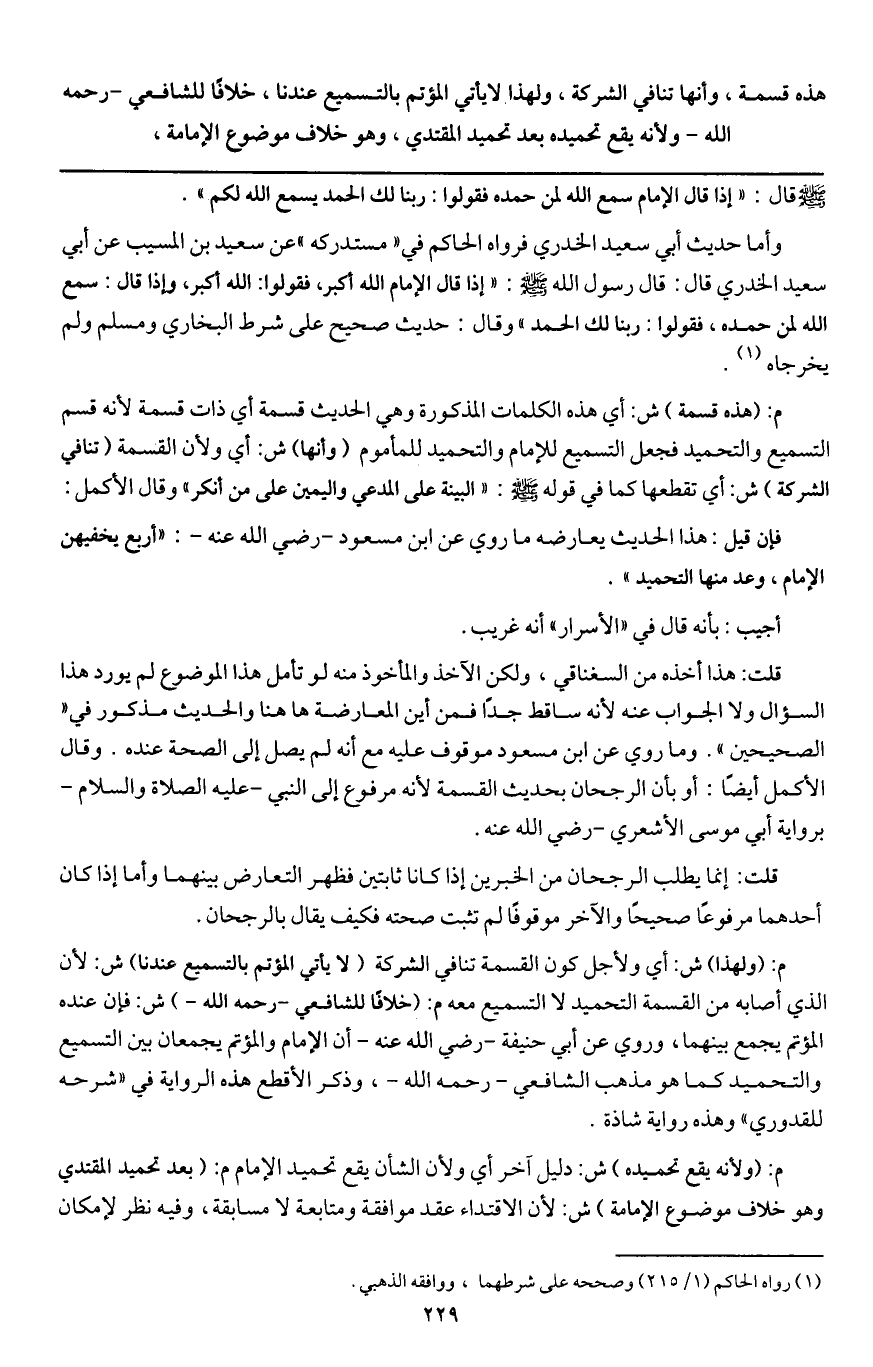 هذه قسمة، وأنها تنافي الشركة، ولهذا لا يأتي المؤتم بالتسميع عندنا، خلافا للشافعي - رَحِمَهُ اللَّهُ - ولأنه يقع تحميده بعد تحميد المقتدي، وهو خلاف موضوع الإمامة،