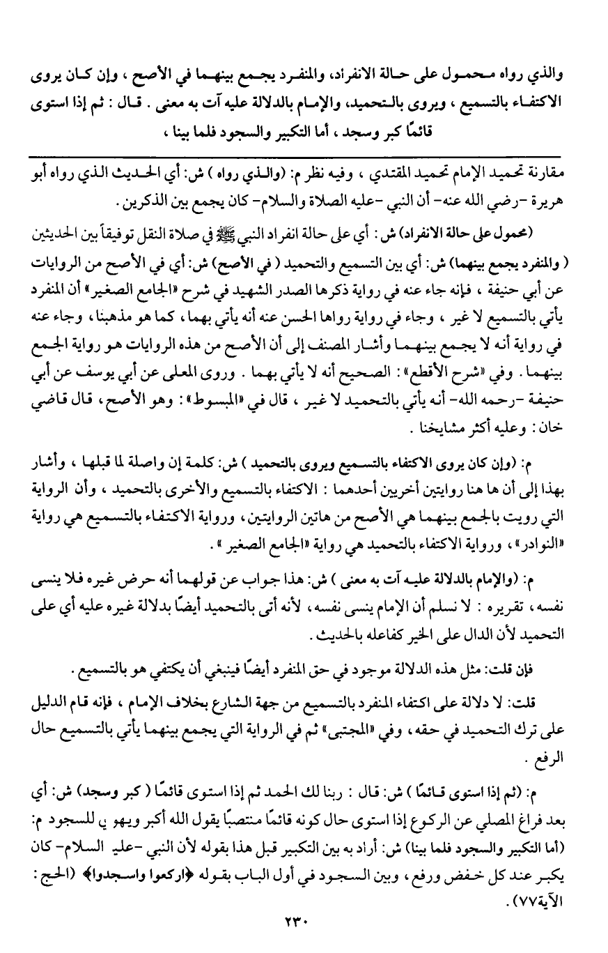 قلت: لا دلالة على اكتفاء المنفرد بالتسميع من جهة الشارع بخلاف الإمام، فإنه قام الدليل على ترك التحميد في حقه، وفي " المجتبى " ثم في الرواية التي يجمع بينهما يأتي بالتسميع حال الرفع.