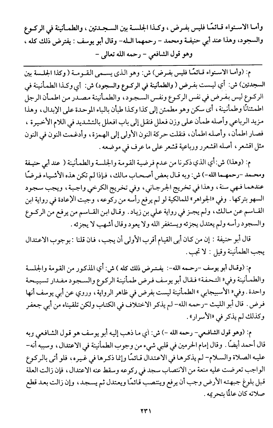 وأما الاستواء قائما فليس بفرض، وكذا الجلسة بين السجدتين، والطمأنينة في الركوع والسجود، وهذا عند أبي حنيفة ومحمد رحمهما الله وقال أبو يوسف: يفترض ذلك كله، وهو قول الشافعي - رَحِمَهُ اللَّهُ تَعَالَى -