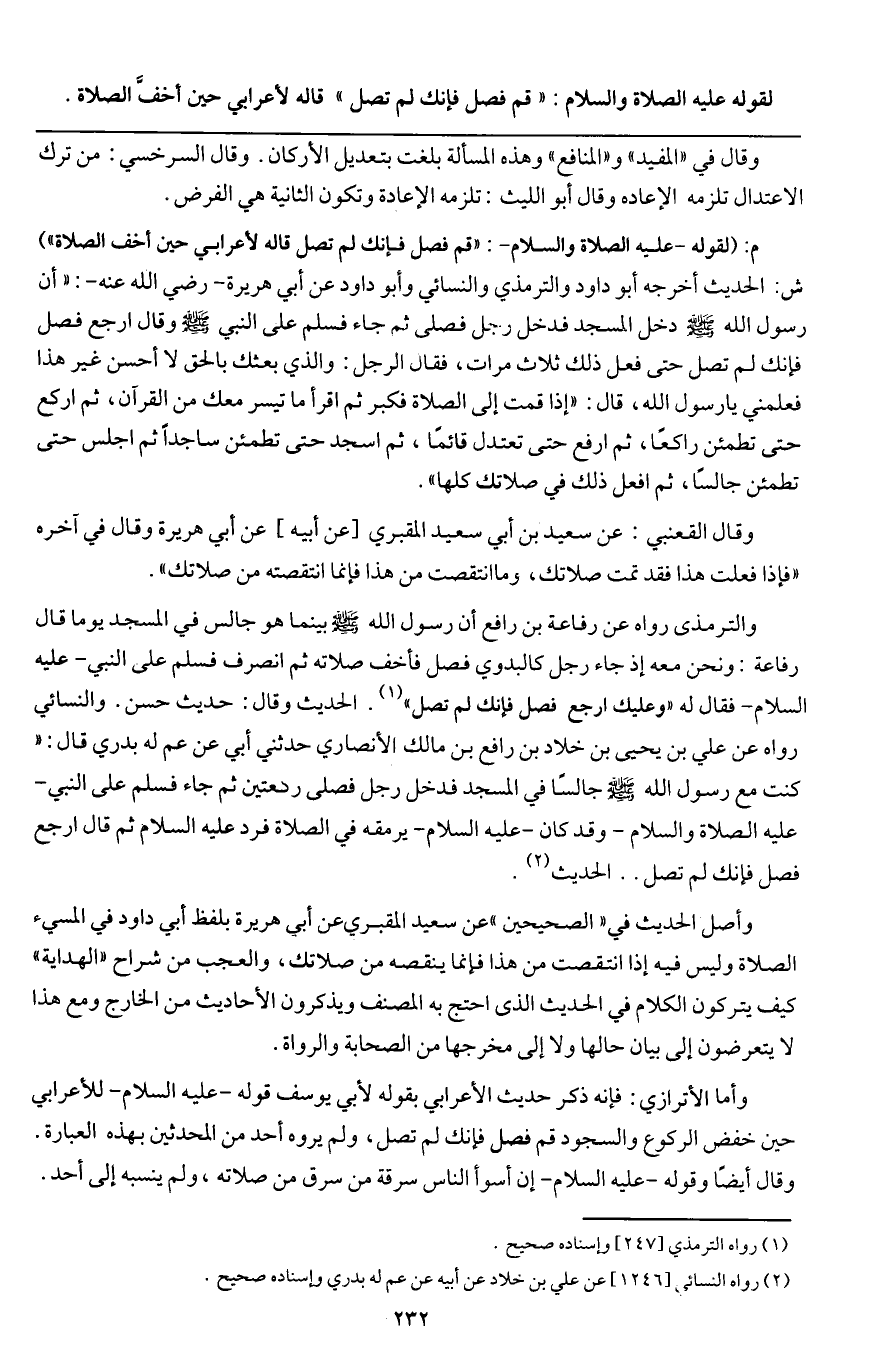 والترمذي رواه عن رفاعة بن رافع «أن رسول الله - صَلَّى اللَّهُ عَلَيْهِ وَسَلَّمَ - بينما هو جالس في المسجد يوما، قال رفاعة: ونحن معه، إذ جاء رجل كالبدوي فصلى فأخف صلاته ثم انصرف فسلم على النبي - عَلَيْهِ السَّلَامُ - فقال له: "وعليك، ارجع فصل فإنك لم تصل» . الحديث، وقال: حديث حسن. والنسائي رواه عن علي بن يحيى بن خلاد بن رافع بن مالك الأنصاري، حدثني أبي عن عم له بدري قال: «كنت مع رسول الله - صَلَّى اللَّهُ عَلَيْهِ وَسَلَّمَ - جالسا في المسجد فدخل رجل فصلى ركعتين ثم جاء فسلم على النبي - عَلَيْهِ الصَّلَاةُ وَالسَّلَامُ - وقد كان - عَلَيْهِ السَّلَامُ - يرمقه في الصلاة فرد - عَلَيْهِ السَّلَامُ - ثم قال: ارجع فصل فإنك لم تصل» .. الحديث.
