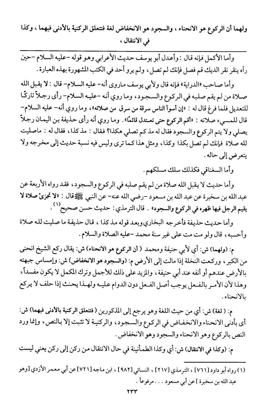 وأما حديث: لا يقبل الله صلاة من لم يقم صلبه في الركوع والسجود، فقد رواه الأربعة عن عبد الله بن سخبرة عن عبد الله بن مسعود - رَضِيَ اللَّهُ عَنْهُ - عن النبي - صَلَّى اللَّهُ عَلَيْهِ وَسَلَّمَ - قال: «لا تجزئ صلاة لا يقيم الرجل فيها ظهره في الركوع والسجود» . قال الترمذي: حديث حسن صحيح.