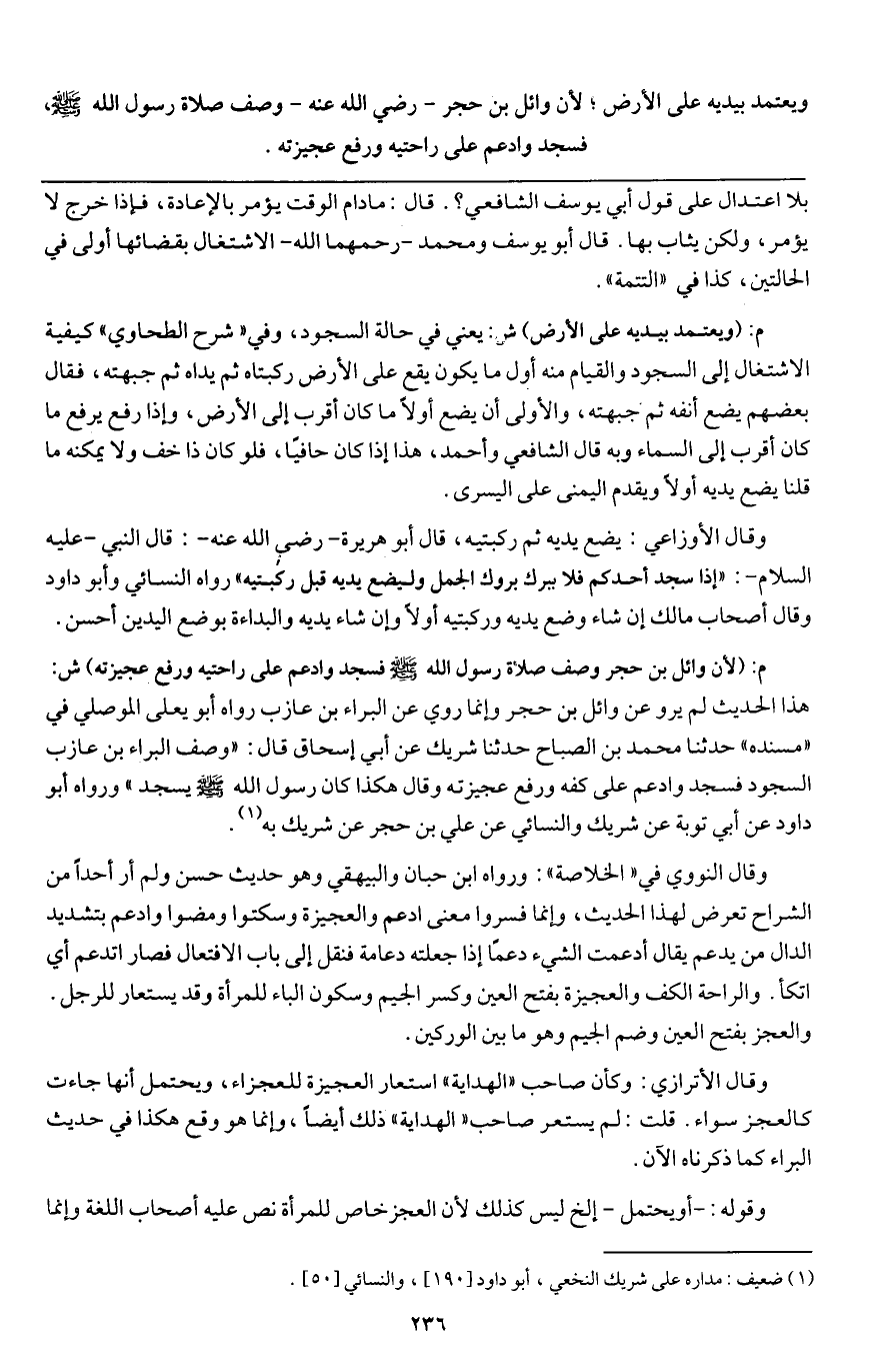م: (لأن وائل بن حجر وصف صلاة رسول الله - صَلَّى اللَّهُ عَلَيْهِ وَسَلَّمَ - «فسجد وادعم على راحتيه ورفع عجيزته» ش: هذا الحديث لم يرو عن وائل بن حجر وإنما روي عن البراء بن عازب، رواه أبو يعلى الموصلي في " مسنده " حدثنا محمد بن الصباح حدثنا شريك عن أبي إسحاق قال: «وصف البراء بن عازب السجود فسجد وادعم على كفه ورفع عجيزته، وقال: هكذا كان رسول الله - صَلَّى اللَّهُ عَلَيْهِ وَسَلَّمَ - يسجد» ورواه أبو داود عن أبي توبة عن شريك، والنسائي عن علي بن حجر عن شريك به.
