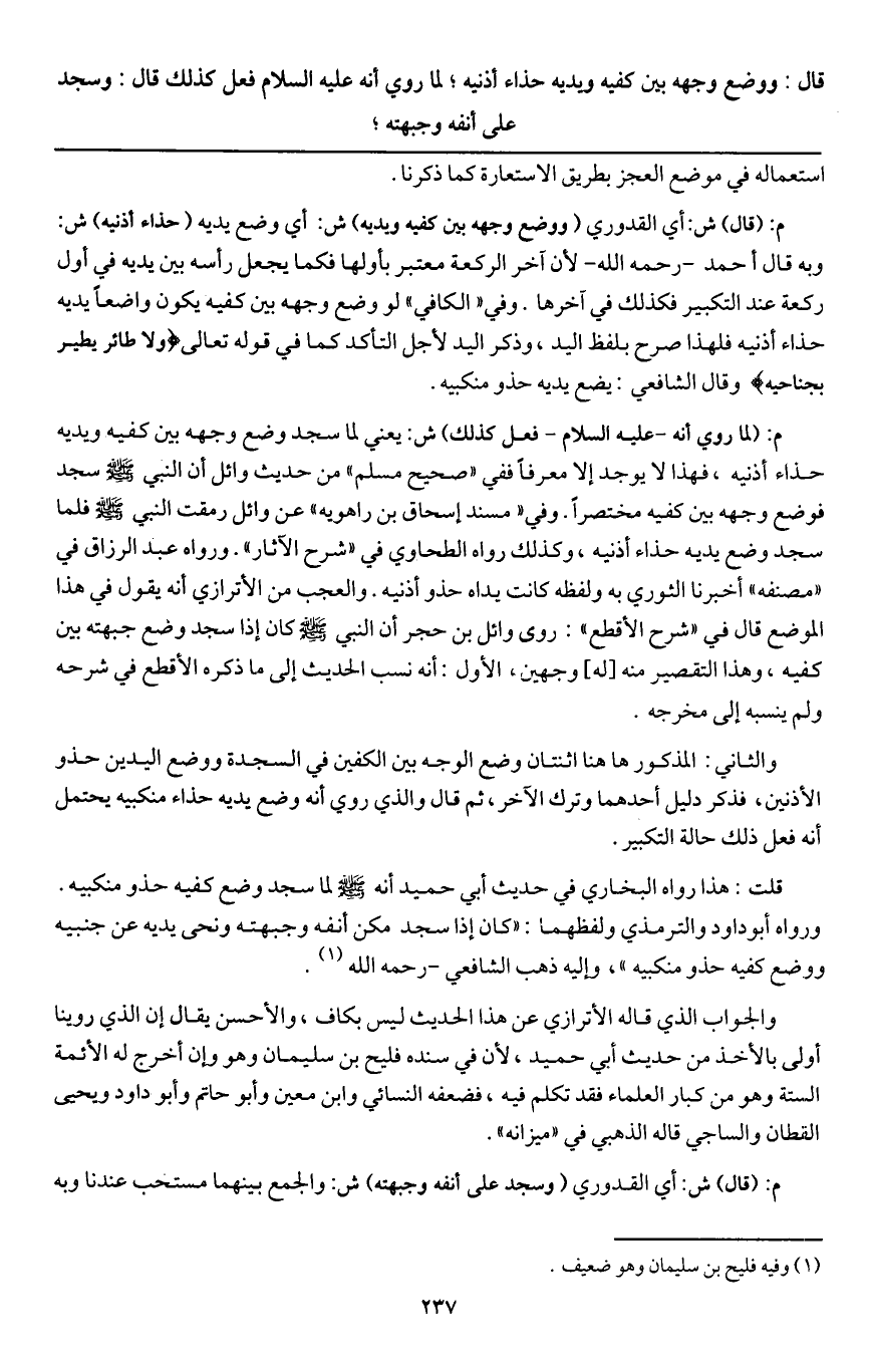 والجواب الذي قاله الأترازي عن هذا الحديث ليس بكاف، والأحسن يقال: إن الذي روينا أولى بالأخذ من حديث أبي حميد، لأن في سنده فليح بن سليمان وهو وإن أخرج له الأئمة الستة وهو من كبار العلماء، فقد تكلم فيه، فضعفه النسائي وابن معين وأبو حاتم وأبو داود ويحيى القطان والساجي، قاله الذهبي في "ميزانه ".