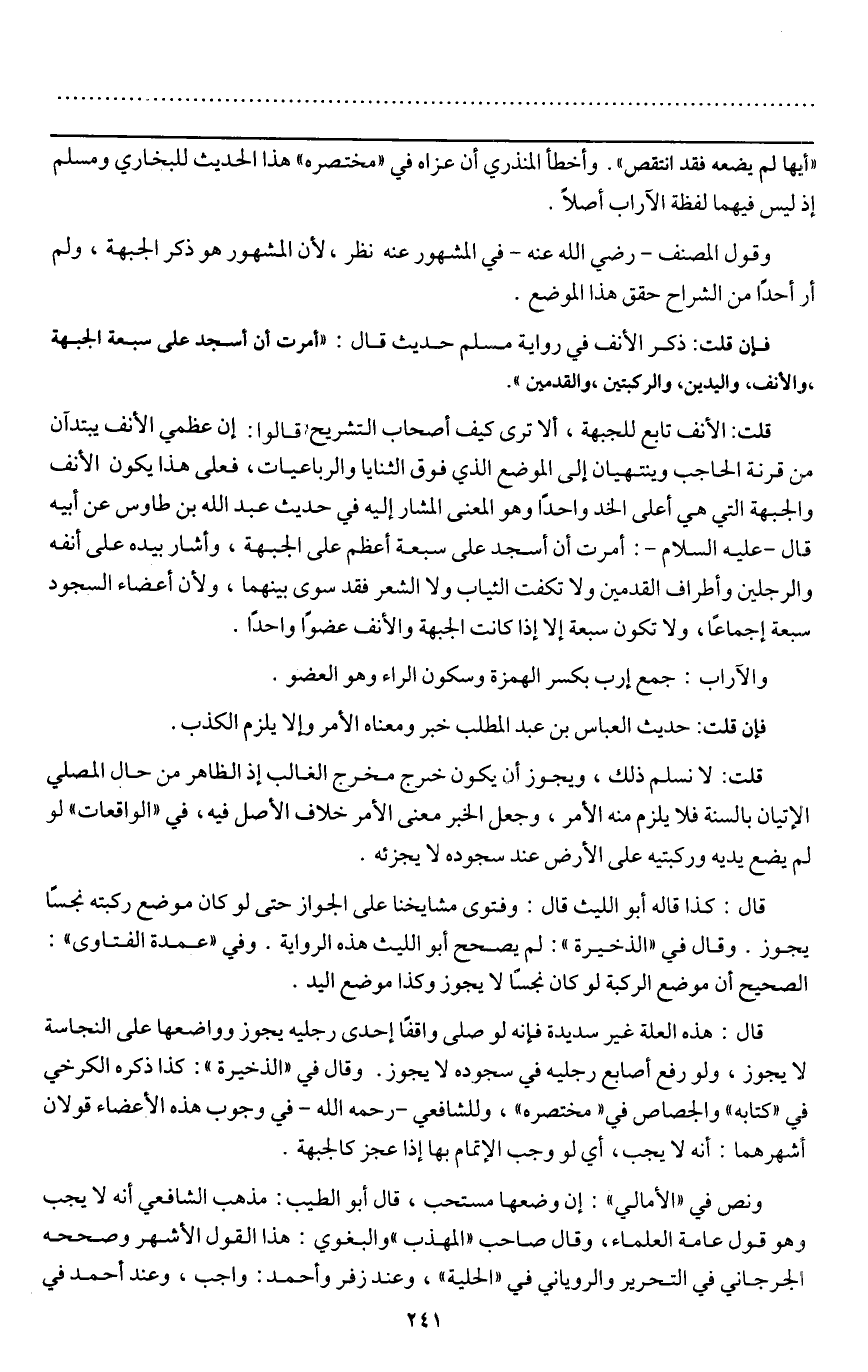 وقول المصنف - رَضِيَ اللَّهُ عَنْهُ -: في المشهور عنه، نظر، لأن المشهور هو ذكر الجبهة، ولم أر أحدا من الشراح حقق هذا الموضع.