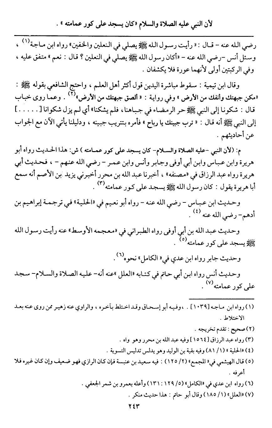 وحديث عبد الله بن أبي أوفى رواه الطبراني في "معجمه الأوسط " عنه «رأيت رسول الله - صَلَّى اللَّهُ عَلَيْهِ وَسَلَّمَ - يسجد على كور عمامته» .