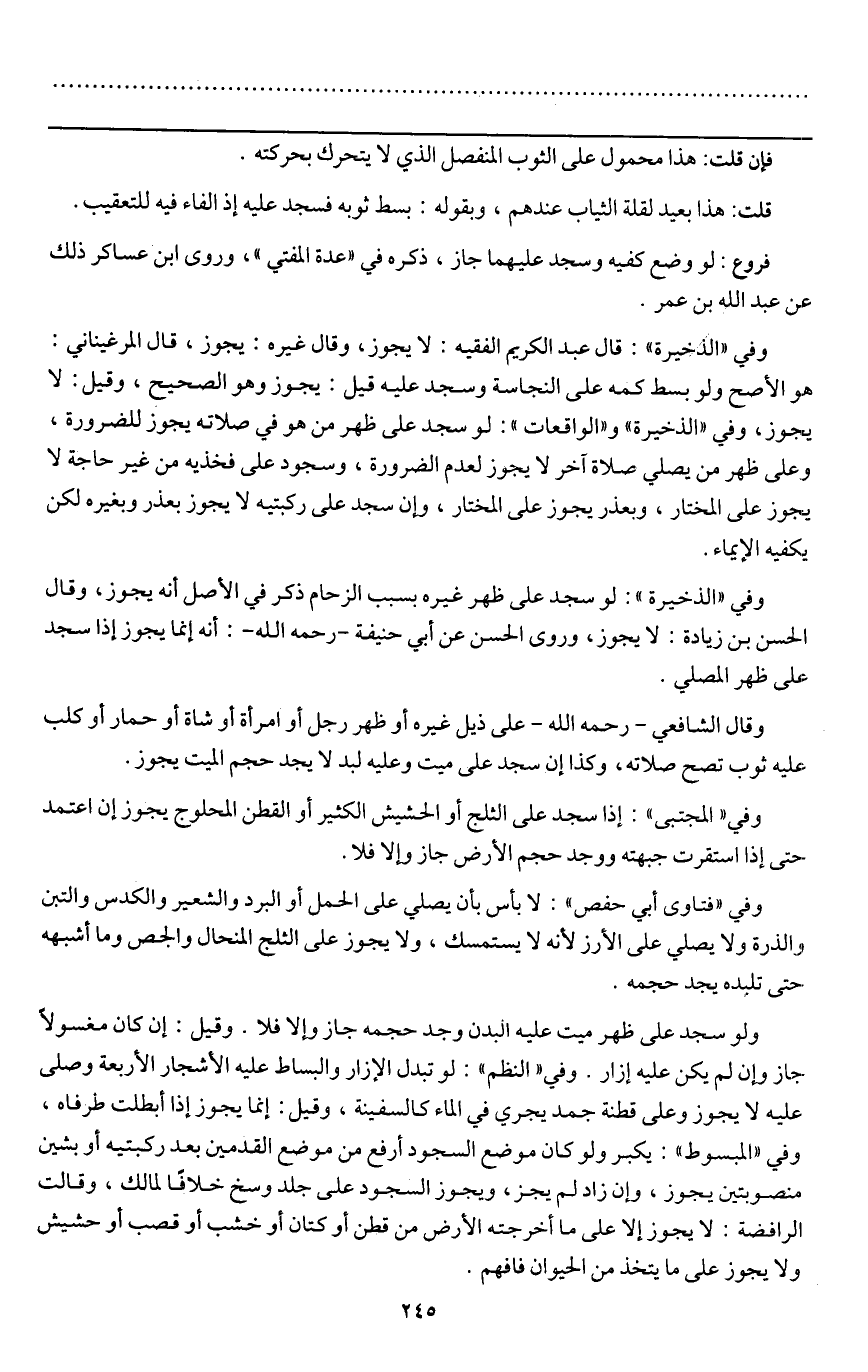 وفي " الذخيرة ": قال عبد الكريم الفقيه: لا يجوز، وقال غيره: يجوز، قال المرغيناني: هو الأصح، ولو بسط كمه على النجاسة وسجد عليه قيل: يجوز وهو الصحيح، وقيل: لا يجوز، وفي " الذخيرة " و " الواقعات ": لو سجد على ظهر من هو في صلاته يجوز للضرورة، وعلى ظهر من يصلي صلاة أخرى لا يجوز لعدم الضرورة، وسجود على فخذيه من غير حاجة لا يجوز على المختار، وبعذر يجوز على المختار، وإن سجد على ركبتيه لا يجوز بعذر وبغيره، لكن يكفيه الإيماء.