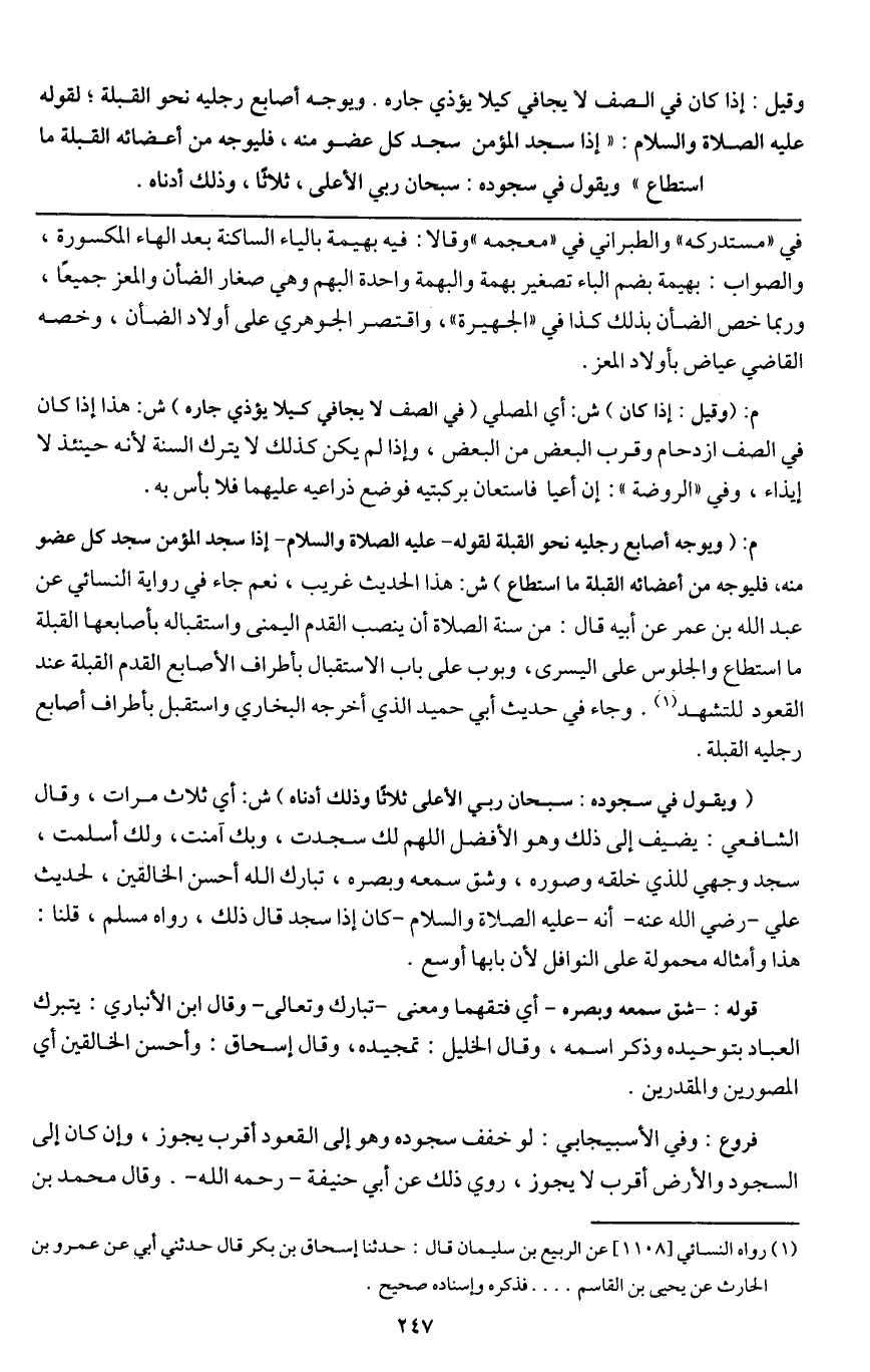 ويوجه أصابع رجليه نحو القبلة؛ لقوله - عَلَيْهِ الصَّلَاةُ وَالسَّلَامُ -: «إذا سجد المؤمن سجد كل عضو منه، فليوجه من أعضائه القبلة ما استطاع»