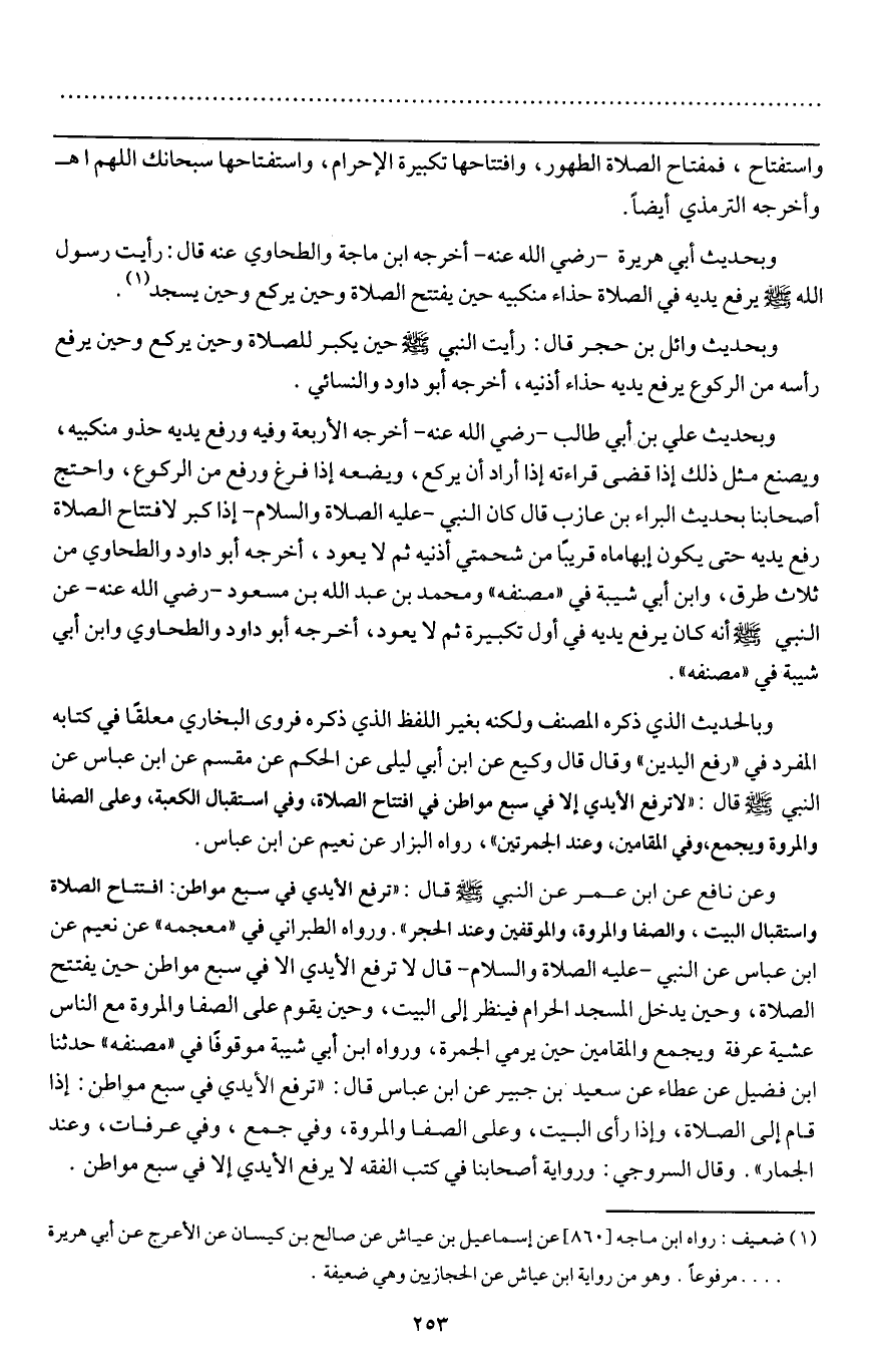 وبحديث أبي هريرة - رَضِيَ اللَّهُ عَنْهُ - أخرجه ابن ماجه والطحاوي عنه، قال: «رأيت رسول الله - صَلَّى اللَّهُ عَلَيْهِ وَسَلَّمَ - يرفع يديه في الصلاة حذاء منكبيه حين يفتتح الصلاة وحين يركع وحين يسجد» .