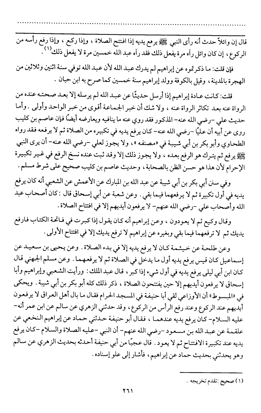 وفي سنن أبي بكر بن أبي شيبة، عن عبد الله بن المبارك، عن الأعمش، عن الشعبي أنه كان يرفع يديه في أول تكبيرة ثم لا يرفعهما فيما بقي. وعن شعبة، عن أبي إسحاق قال: كان أصحاب عبد الله وأصحاب علي - رَضِيَ اللَّهُ عَنْهُمْ - لا يرفعون أيديهم إلا في افتتاح الصلاة.
