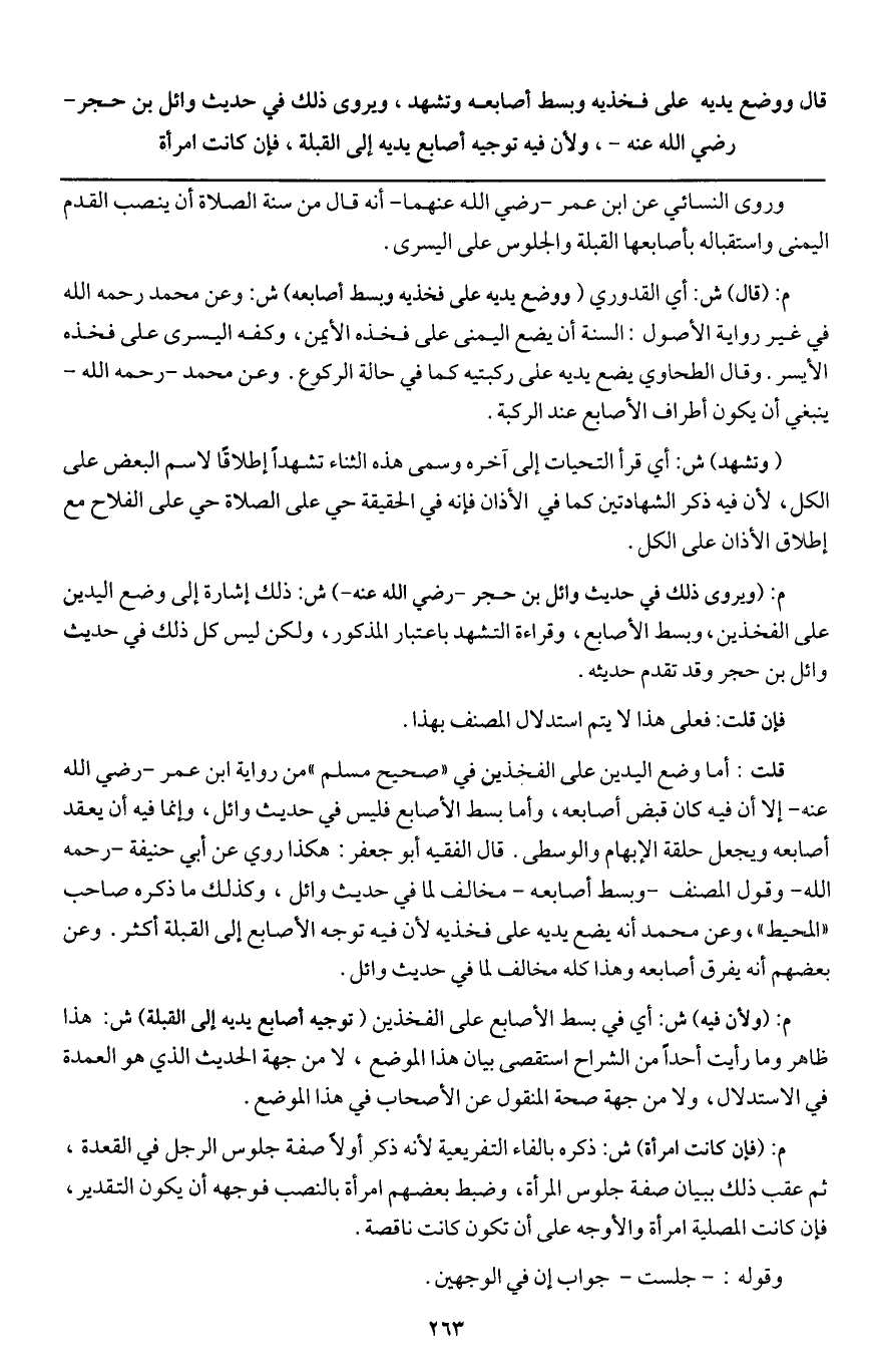 قلت: أما وضع اليدين على الفخذين في " صحيح مسلم " من رواية ابن عمر - رَضِيَ اللَّهُ عَنْهُ - إلا أن فيه كان قبض أصابعه، وأما بسط الأصابع فليس في حديث وائل، وإنما فيه أن يعقد أصابعه ويجعل حلقة الإبهام والوسطى. قال الفقيه أبو جعفر: هكذا روي عن أبي حنيفة - رَحِمَهُ اللَّهُ - وقول المصنف -: وبسط أصابعه - مخالف لما في حديث وائل، وكذلك ما ذكره صاحب " المحيط "، وعن محمد أنه يضع يديه على فخذيه؛ لأن فيه توجه الأصابع إلى القبلة أكثر. وعن بعضهم أنه يفرق أصابعه وهذا كله مخالف لما في حديث وائل.