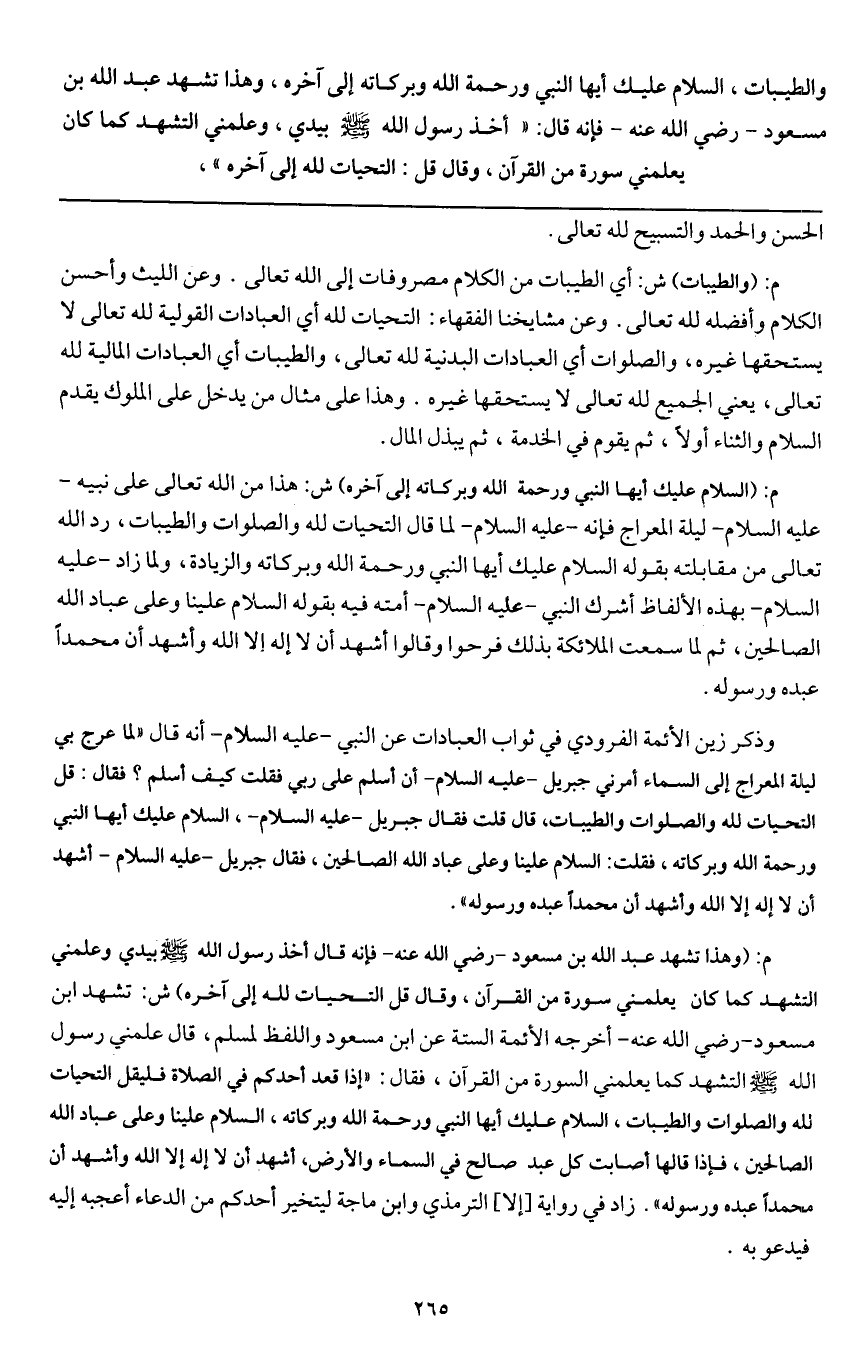 وذكر زين الأئمة الفرودي في ثواب العبادات عن النبي - عَلَيْهِ السَّلَامُ - أنه قال: «لما عرج بي ليلة المعراج إلى السماء أمرني جبريل - عَلَيْهِ السَّلَامُ - أن أسلم على ربي فقلت: كيف أسلم؟ فقال: قل: التحيات لله والصلوات والطيبات، قال: قلت: فقال جبريل - عَلَيْهِ السَّلَامُ -، السلام عليك أيها النبي ورحمة الله وبركاته، فقلت: السلام علينا وعلى عباد الله الصالحين، فقال جبريل - عَلَيْهِ السَّلَامُ -: أشهد أن لا إله الله، وأشهد أن محمدا عبده ورسوله» ".