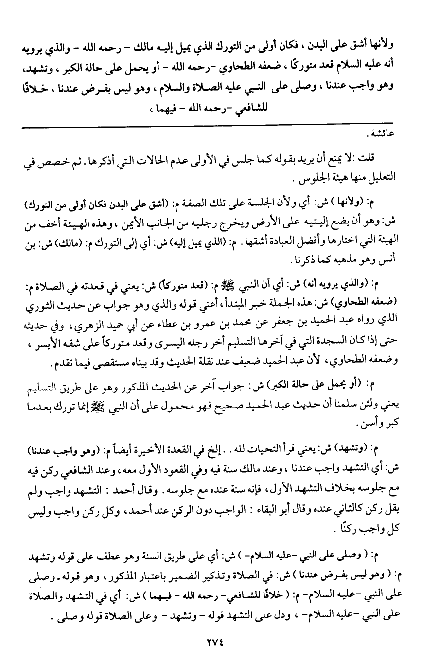 ولأنها أشق على البدن، فكان أولى من التورك الذي يميل إليه مالك - رَحِمَهُ اللَّهُ - والذي يرويه «أنه - عَلَيْهِ السَّلَامُ - قعد متوركا» ضعفه الطحاوي - رَحِمَهُ اللَّهُ - أو يحمل على حالة الكبر، وتشهد، وهو واجب عندنا،