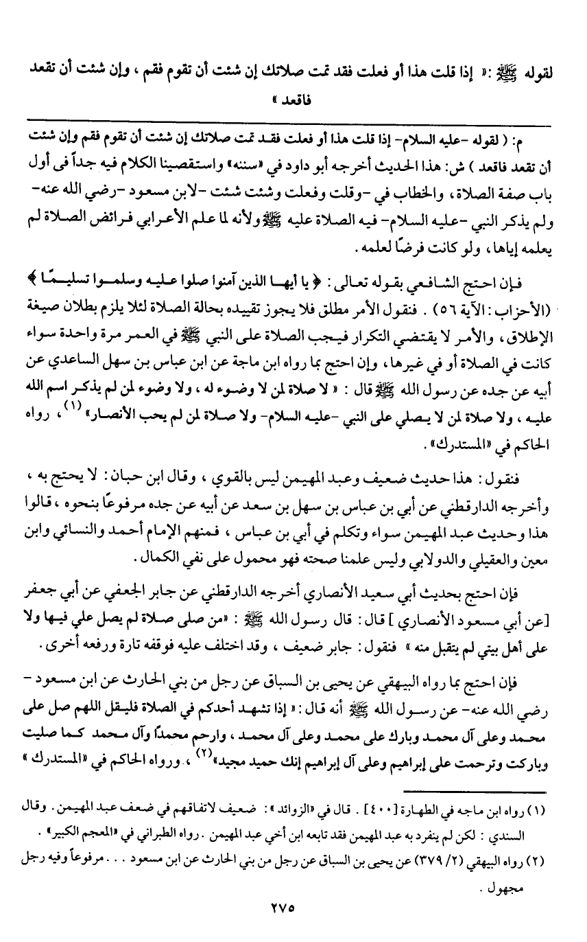 فإن احتج بحديث أبي سعيد الأنصاري، أخرجه الداراقطني عن جابر الجعفي، عن أبي جعفر [عن أبي مسعود الأنصاري] قال: قال رسول الله - صَلَّى اللَّهُ عَلَيْهِ وَسَلَّمَ -: «من صلى صلاة لم يصل علي فيها ولا على أهل بيتي لم يتقبل منه» " فنقول: جابر ضعيف، وقد اختلف عليه فوقفه تارة، ورفعه أخرى.