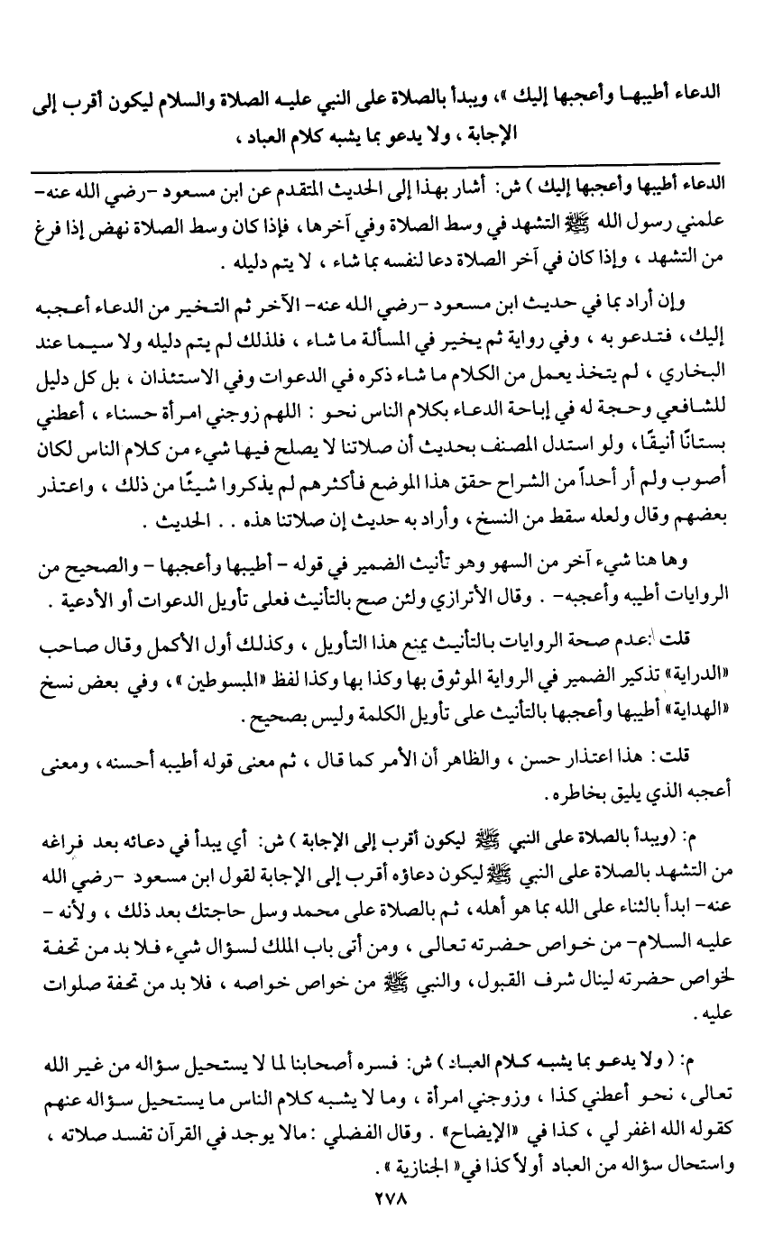 ـــــــــــــــــــــــــــــQالدعاء أطيبها وأعجبها إليك» ش: أشار بهذا إلى الحديث المتقدم عن ابن مسعود - رَضِيَ اللَّهُ عَنْهُ - «علمني رسول الله - صَلَّى اللَّهُ عَلَيْهِ وَسَلَّمَ - التشهد في وسط الصلاة وفي آخرها» فإذا كان وسط الصلاة نهض إذا فرغ من التشهد، وإذا كان في آخر الصلاة دعا لنفسه بما شاء، لا يتم دليله.