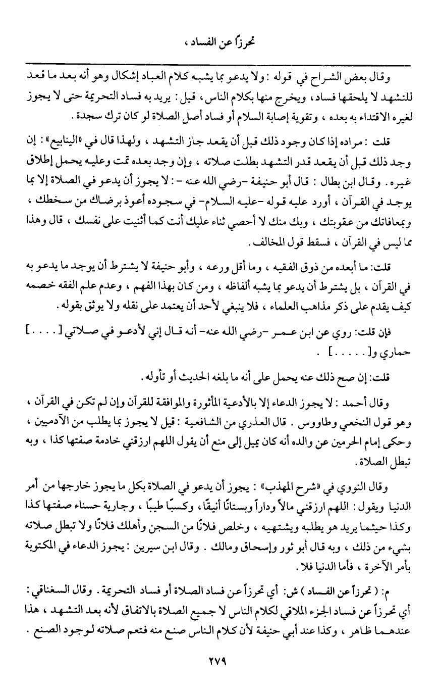 ـــــــــــــــــــــــــــــQوقال بعض الشراح في قوله: ولا يدعو بما يشبه كلام العباد إشكال وهو أنه بعد ما قعد للتشهد لا يلحقها فساد، ويخرج منها بكلام الناس، قيل: يريد به فساد التحريمة حتى لا يجوز لغيره الاقتداء به بعده، وتقوية إصابة السلام أو فساد أصل الصلاة لو كان ترك سجدة.