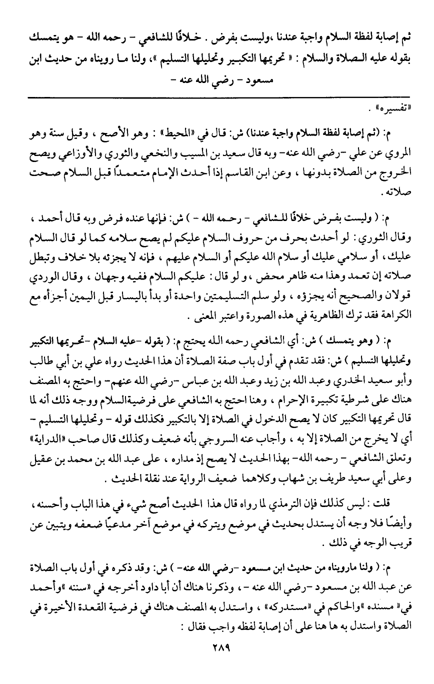 ثم إصابة لفظة السلام واجبة عندنا، وليست بفرض. خلافا للشافعي - رَحِمَهُ اللَّهُ - هو يتمسك بقوله - عَلَيْهِ الصَّلَاةُ وَالسَّلَامُ -: «تحريمها التكبير وتحليلها التسليم» ، ولنا ما رويناه من حديث ابن مسعود - رَضِيَ اللَّهُ عَنْهُ -