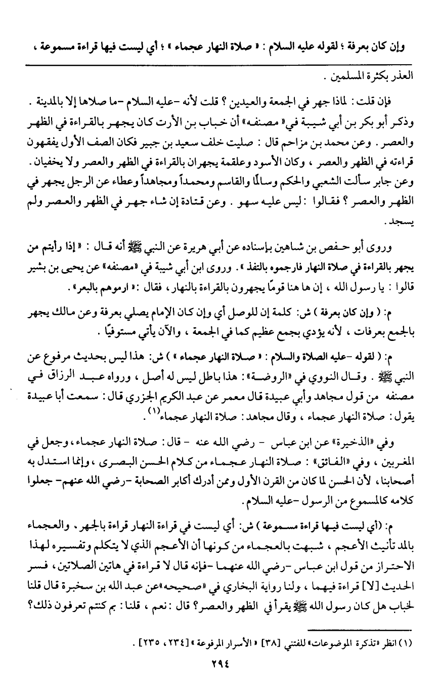 وفي " الذخيرة " عن ابن عباس - رَضِيَ اللَّهُ عَنْهُمْ - قال: صلاة النهار عجماء، وجعل في المغربين، وفي " الفائق ": صلاة النهار عجماء من كلام الحسن البصرى، وإنما استدل به أصحابنا؛ لأن الحسن لما كان من القرن الأول وممن أدرك أكابر الصحابة - رَضِيَ اللَّهُ عَنْهُمْ - جعلوا كلامه كالمسموع من الرسول - عَلَيْهِ السَّلَامُ -.