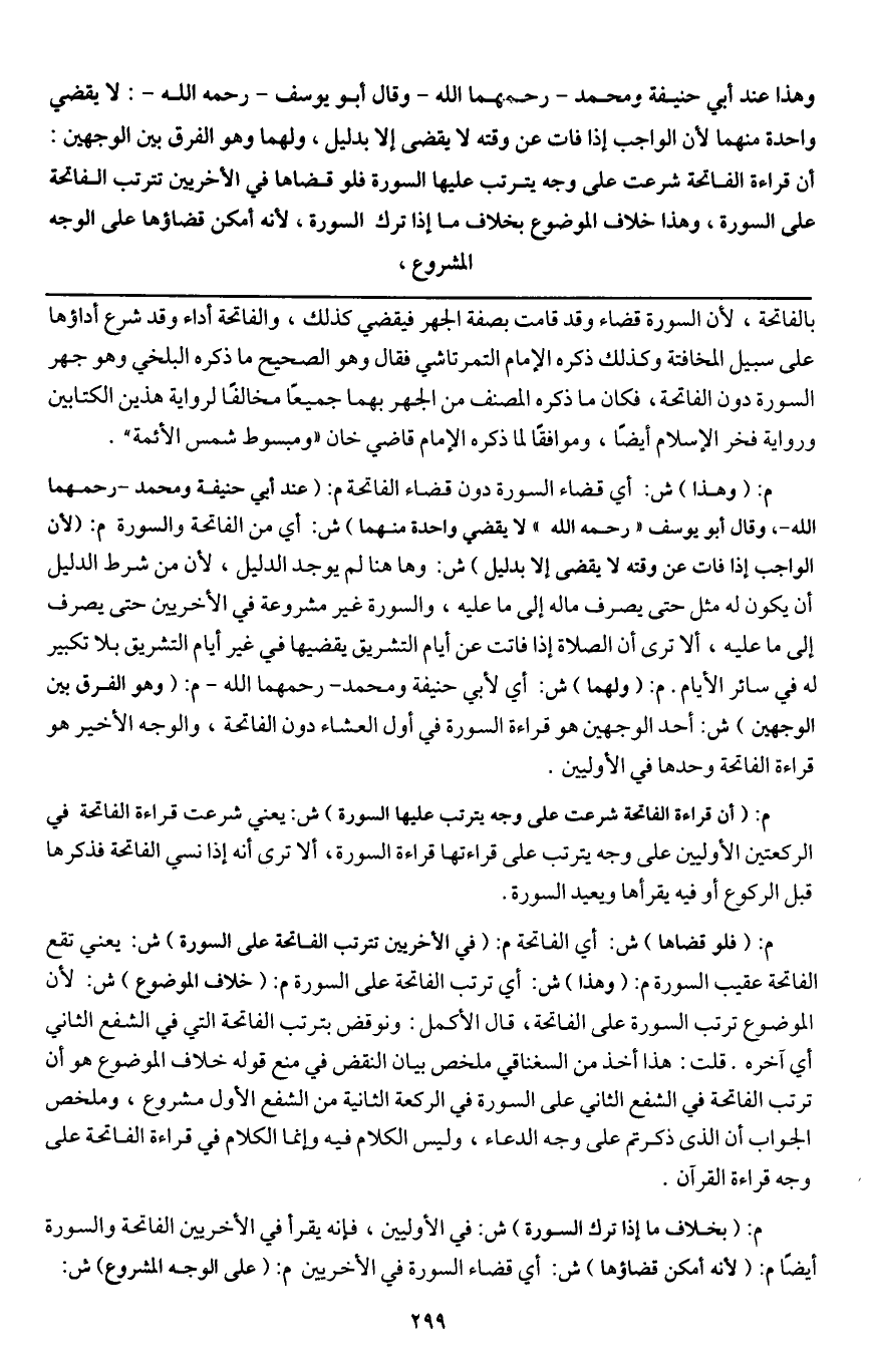 م: (أن قراءة الفاتحة شرعت على وجه يترتب عليها السورة) ش: يعني شرعت قراءة الفاتحة في الركعتين الأوليين على وجه يترتب على قراءتها قراءة السورة، ألا ترى أنه إذا نسي الفاتحة فذكرها قبل الركوع أو فيه يقرأها ويعيد السورة.