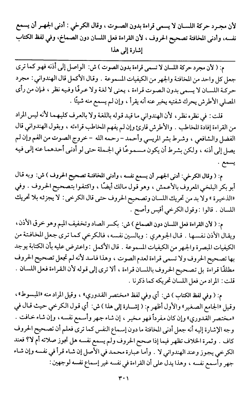 وثمرة الخلاف تظهر فيما إذا صحح الحروف ولم يسمع نفسه هل تجوز صلاته أم لا؟ فعند الكرخي يجوز وعند الهندواني لا. وأما عبارة محمد في الأصل إن شاء قرأ في نفسه، وإن شاء جهر وأسمع نفسه، وهذا يدل على أن القراءة في نفسه غير إسماع نفسه لوجهين: