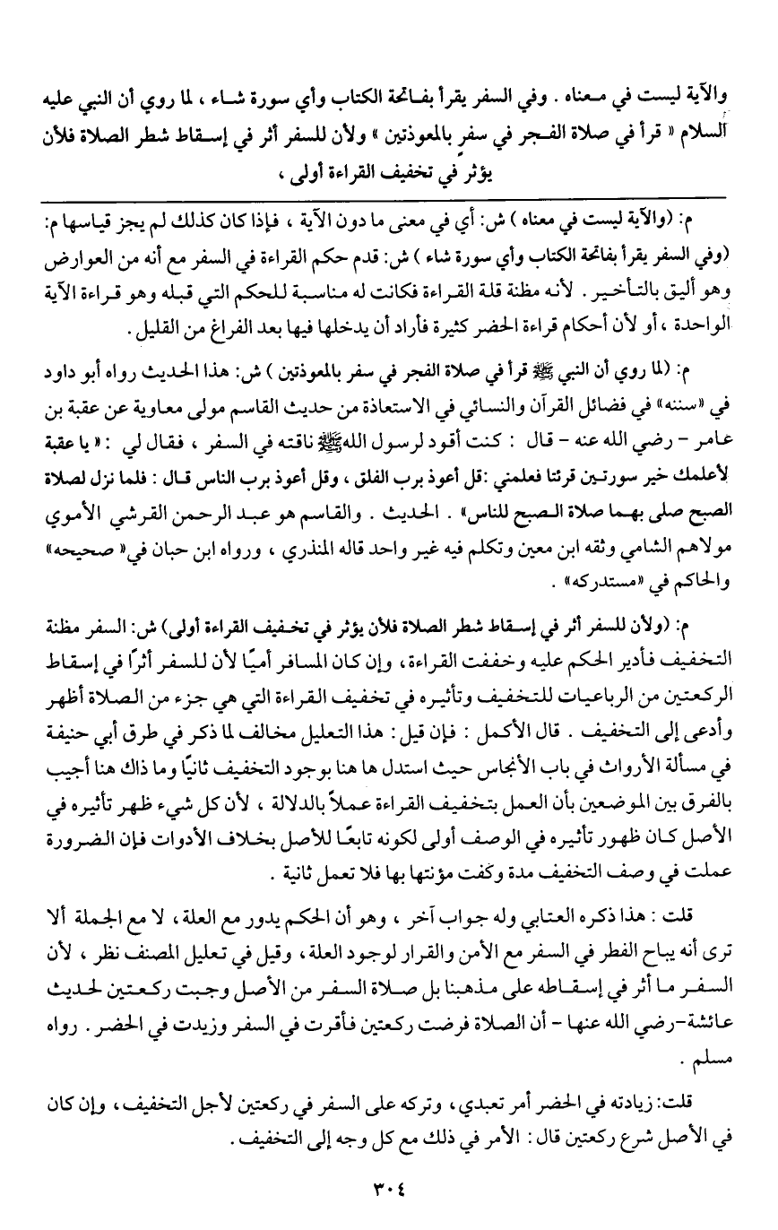 قلت: هذا ذكره العتابي وله جواب آخر، وهو أن الحكم يدور مع العلة، لا مع الجملة ألا ترى أنه يباح الفطر في السفر مع الأمن والقرار لوجود العلة، وقيل: في تعليل المصنف نظر؛ لأن السفر ما أثر في إسقاطه على مذهبنا؛ بل صلاة السفر من الأصل وجبت ركعتين؛ لحديث عائشة - رَضِيَ اللَّهُ عَنْهَا - «أن الصلاة فرضت ركعتين فأقرت في السفر وزيدت في الحضر» . رواه مسلم.