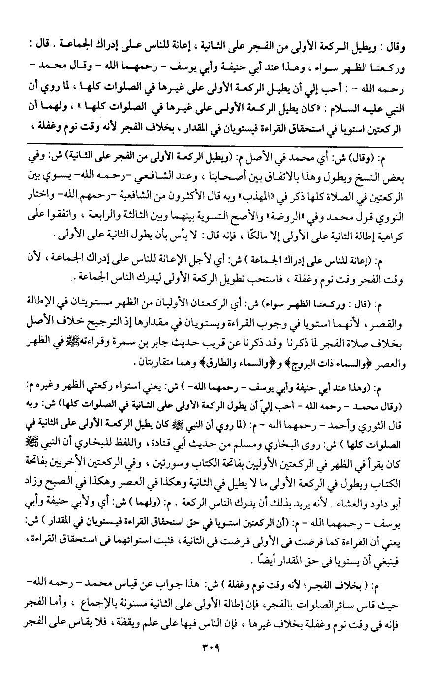 ـــــــــــــــــــــــــــــQ (وقال) ش: أي محمد في الأصل م: (ويطيل الركعة الأولى من الفجر على الثانية) ش: وفي بعض النسخ ويطول وهذا بالاتفاق بين أصحابنا، وعند الشافعي - رَحِمَهُ اللَّهُ - يسوي بين الركعتين في الصلاة كلها ذكر في " المهذب " وبه قال الأكثرون من الشافعية - رَحِمَهُمُ اللَّهُ - واختار النووي قول محمد وفي " الروضة " والأصح التسوية بينهما وبين الثالثة والرابعة، واتفقوا على كراهية إطالة الثانية على الأولى إلا مالكا، فإنه قال: لا بأس بأن يطول الثانية على الأولى.