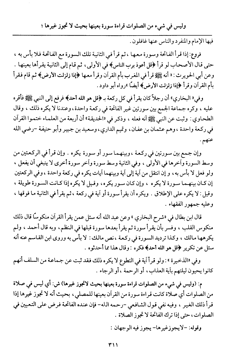 وليس في شيء من الصلوات قراءة سورة بعينها بحيث لا تجوز غيرها