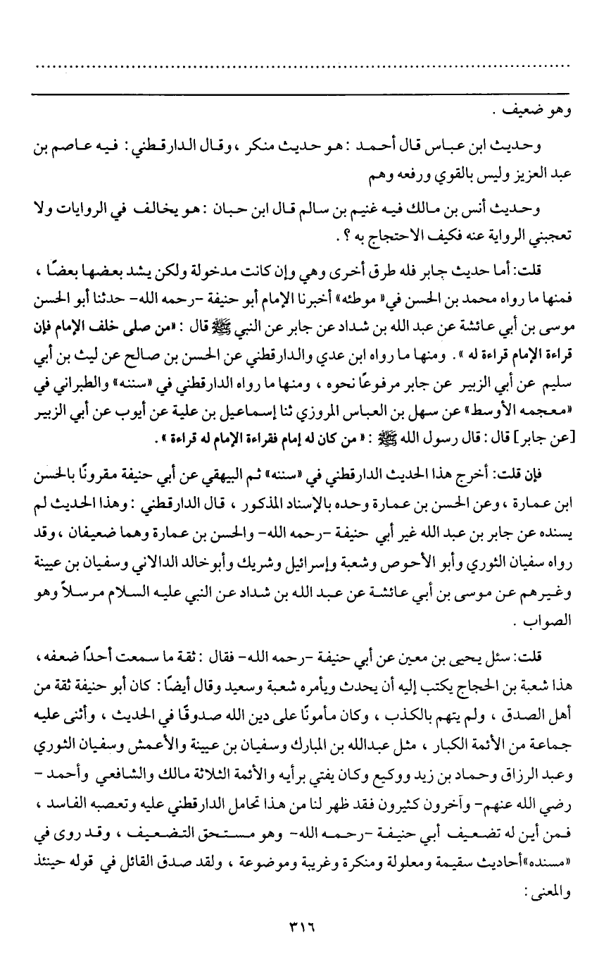 قلت: سئل يحيى بن معين عن أبي حنيفة - رَحِمَهُ اللَّهُ - فقال: ثقة ما سمعت أحدا ضعفه، هذا شعبة بن الحجاج يكتب إليه أن يحدث ويأمره شعبة وسعيد وقال أيضا: كان أبو حنيفة ثقة من أهل الصدق، ولم يتهم بالكذب، وكان مأمونا على دين الله صدوقا في الحديث، وأثنى عليه جماعة من الأئمة الكبار، مثل عبد الله بن المبارك، وسفيان بن عيينة، والأعمش، وسفيان الثوري، وعبد الرزاق، وحماد بن زيد، ووكيع وكان يفتي برأيه والأئمة الثلاثة مالك والشافعي وأحمد - رَضِيَ اللَّهُ عَنْهُمْ - وآخرون كثيرون فقد ظهر لنا من هذا تحامل الدارقطني عليه وتعصبه الفاسد، فمن أين له تضعيف أبي حنيفة - رَحِمَهُ اللَّهُ - وهو مستحق التضعيف، وقد روى في "مسنده" أحاديث سقيمة ومعلولة ومنكرة وغريبة وموضوعة، ولقد صدق القائل في قوله حينئذ والمعنى: