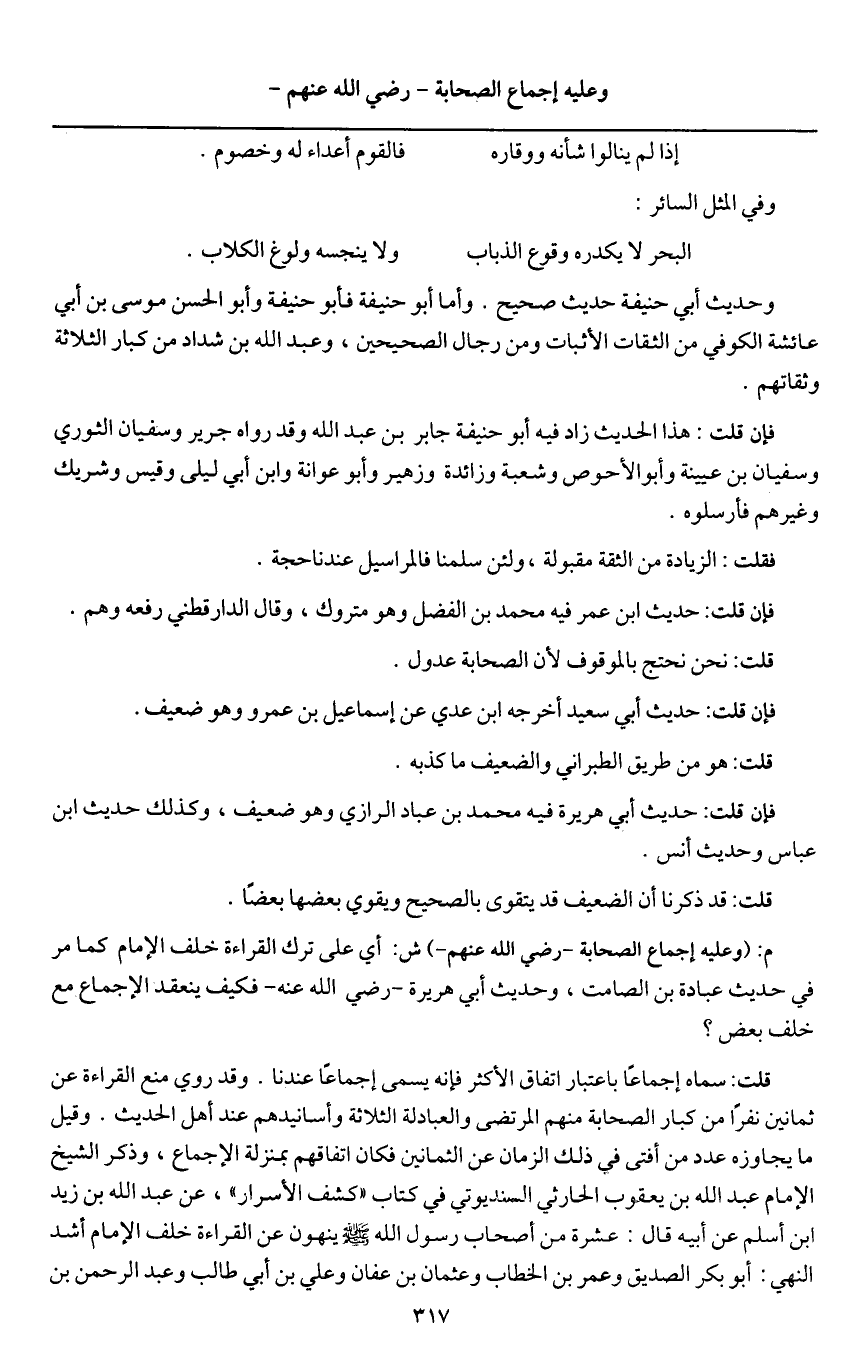 قلت: سماه إجماعا باعتبار اتفاق الأكثر فإنه يسمى إجماعا عندنا. وقد روي منع القراءة عن ثمانين نفرا من كبار الصحابة منهم المرتضى والعبادلة الثلاثة، وأسانيدهم عند أهل الحديث. وقيل ما يجاوزه عدد من أفتى في ذلك الزمان عن الثمانين فكان اتفاقهم بمنزلة الإجماع، وذكر الشيخ الإمام عبد الله بن يعقوب الحارثي السنديوتي في كتاب " كشف الأسرار "، عن عبد الله بن زيد بن أسلم عن أبيه قال: عشرة من أصحاب رسول الله - صَلَّى اللَّهُ عَلَيْهِ وَسَلَّمَ - ينهون عن القراءة خلف الإمام أشد النهي: أبو بكر الصديق، وعمر بن الخطاب، وعثمان بن عفان، وعلي بن أبي طالب، وعبد الرحمن بن
