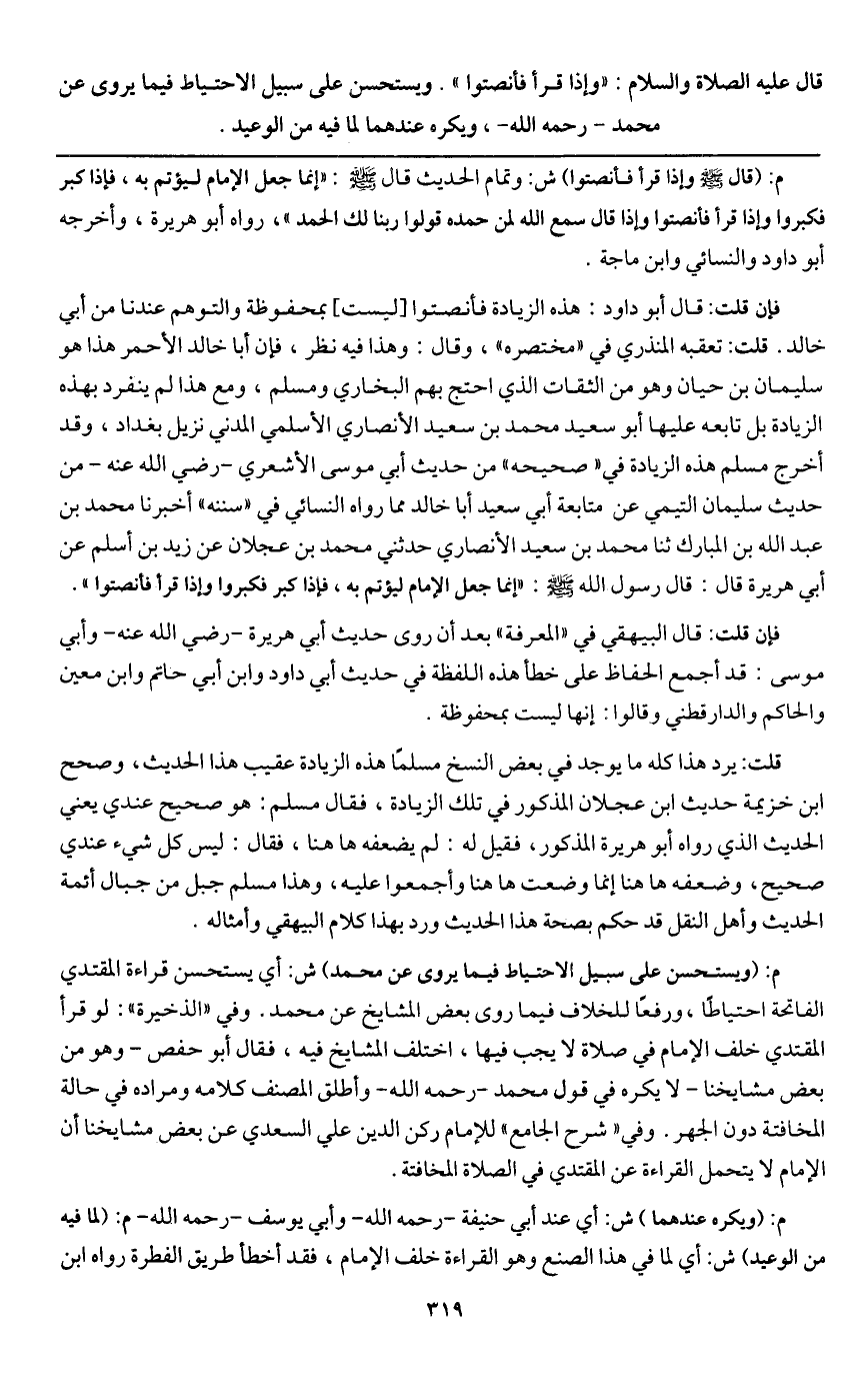 ـــــــــــــــــــــــــــــQم: (قال - صَلَّى اللَّهُ عَلَيْهِ وَسَلَّمَ - «وإذا قرأ فأنصتوا» ش: وتمام الحديث قال - صَلَّى اللَّهُ عَلَيْهِ وَسَلَّمَ -: " «إنما جعل الإمام ليؤتم به، فإذا كبر فكبروا، وإذا قرأ فأنصتوا، وإذا قال سمع الله لمن حمده قولوا: ربنا لك الحمد» ، رواه أبو هريرة، وأخرجه أبو داود، والنسائي، وابن ماجه.