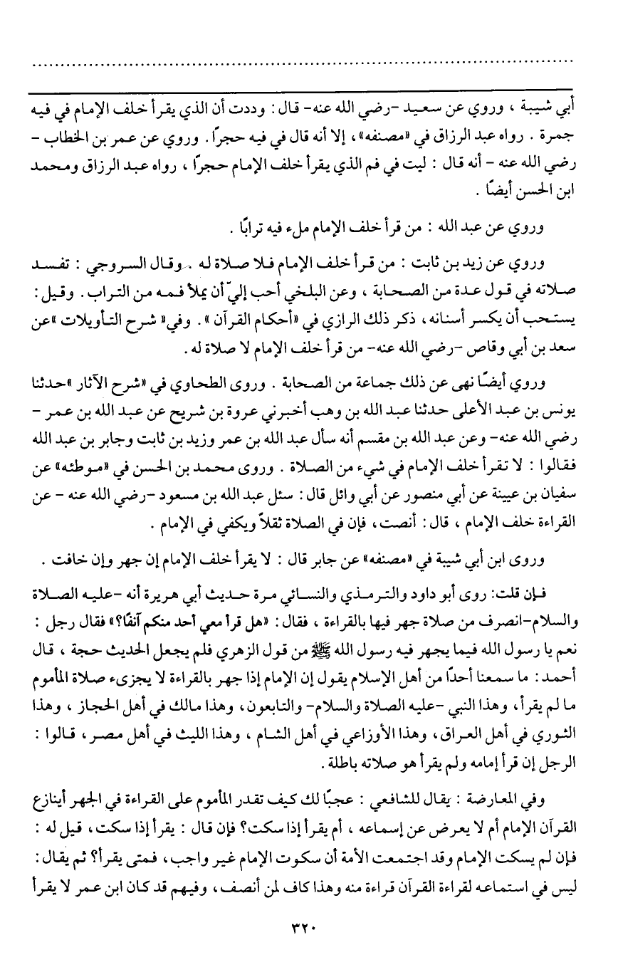 وروي عن عمر بن الخطاب - رَضِيَ اللَّهُ عَنْهُ - أنه قال: ليت في فم الذي يقرأ خلف الإمام حجرا، رواه عبد الرزاق، ومحمد بن الحسن أيضا.