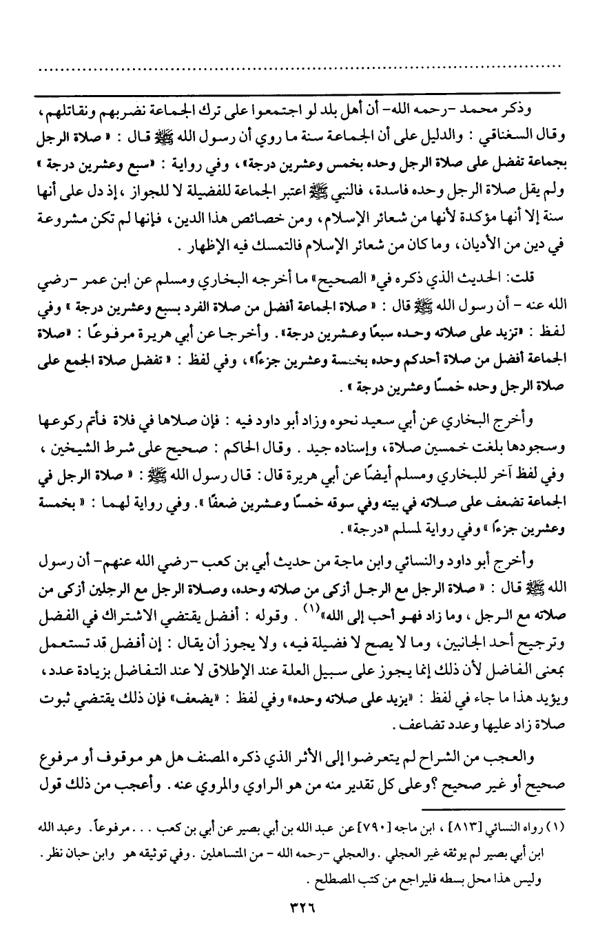 وأخرج أبو داود، والنسائي، وابن ماجه من حديث أبي بن كعب - رَضِيَ اللَّهُ عَنْهُمْ - أن رسول الله - صَلَّى اللَّهُ عَلَيْهِ وَسَلَّمَ - قال: «صلاة الرجل مع الرجل أزكى من صلاته وحده، وصلاة الرجل مع الرجلين أزكى من صلاته مع الرجل، وما زاد فهو أحب إلى الله» ". وقوله: أفضل يقتضي الاشتراك في الفضل وترجيح أحد الجانبين، وما لا يصح لا فضيلة فيه، ولا يجوز أن يقال: إن أفضل قد تستعمل بمعنى الفاضل؛ لأن ذلك إنما يجوز على سبيل العلة عند الإطلاق، لا عند التفاضل بزيادة عدد، ويؤيد هذا ما جاء في لفظ: «يزيد على صلاته وحده» وفي لفظ: " يضعف " فإن ذلك يقتضي ثبوت صلاة زاد عليها وعدد تضاعف.
