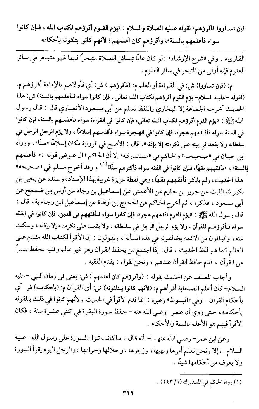 فإن تساووا فأقرؤهم؛ لقوله - عَلَيْهِ الصَّلَاةُ وَالسَّلَامُ -: «يؤم القوم أقرؤهم لكتاب الله، فإن كانوا سواء فأعلمهم بالسنة» وأقرؤهم كان أعلمهم؛ لأنهم كانوا يتلقونه بأحكامه.